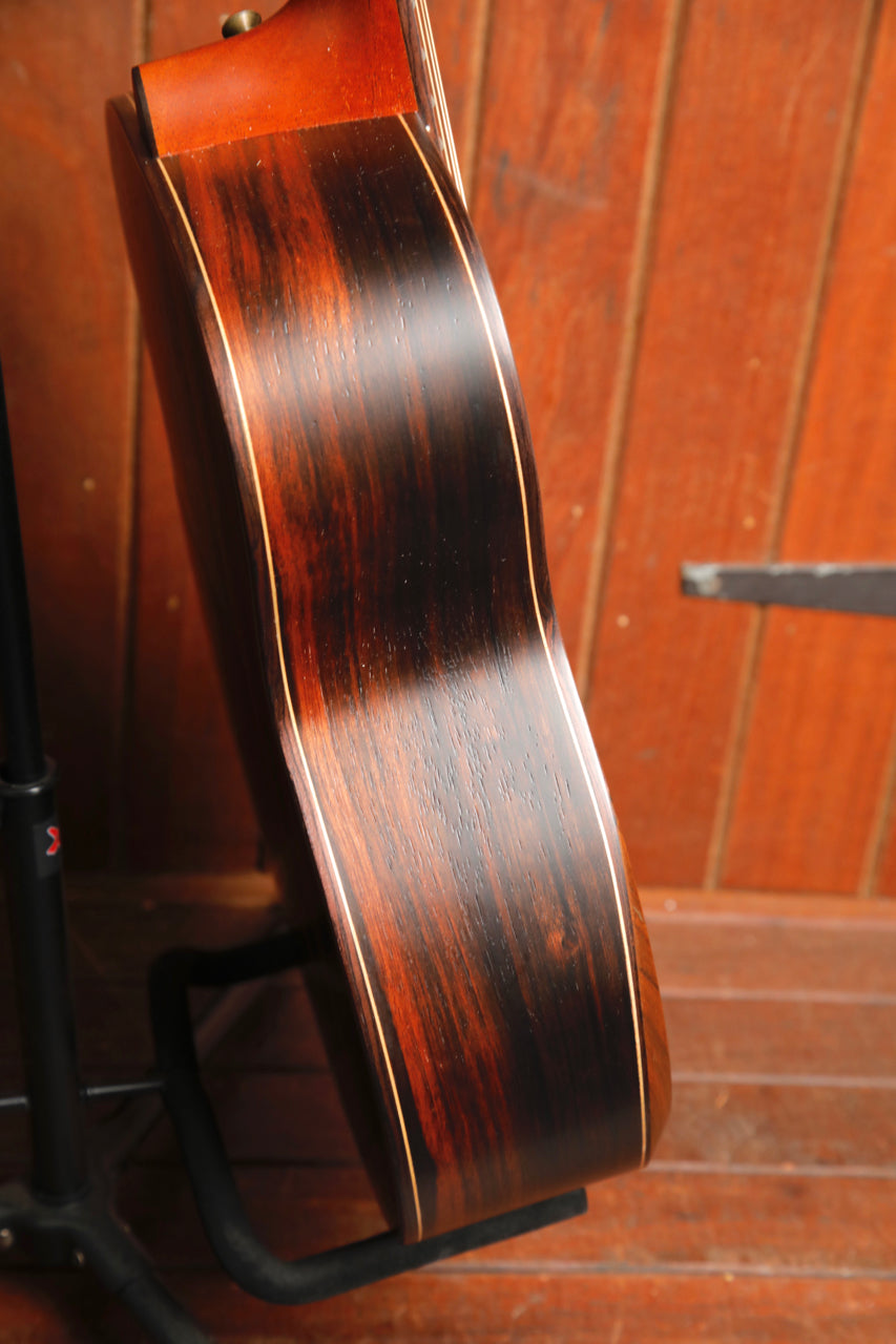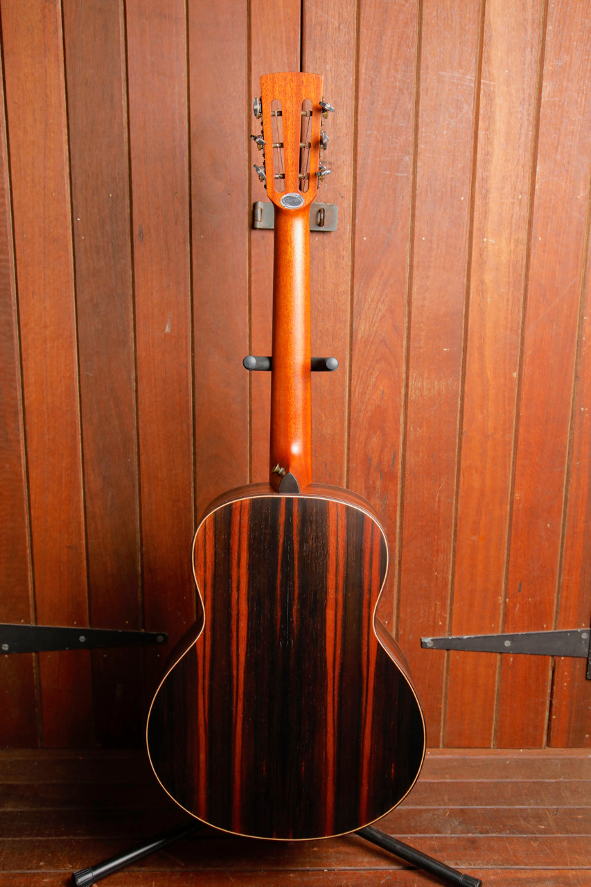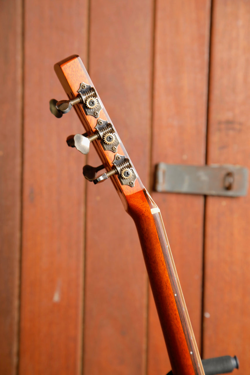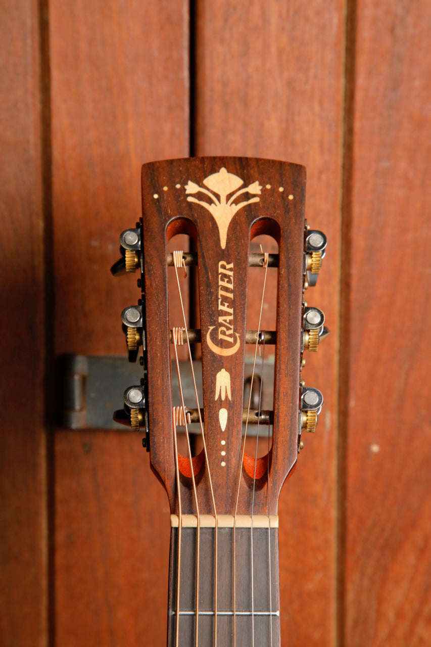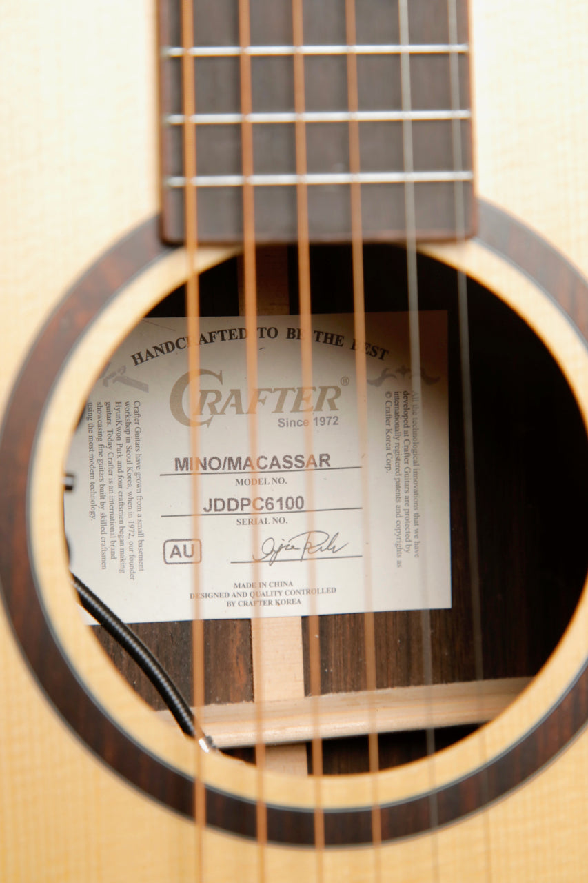Pre-owned in excellent condition, this Crafter Mino/Macassar features a solid spruce top and macassar ebony back & sides. This is a great travel size guitar equipped with a DS-2 Pro pickup system.