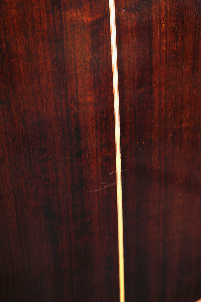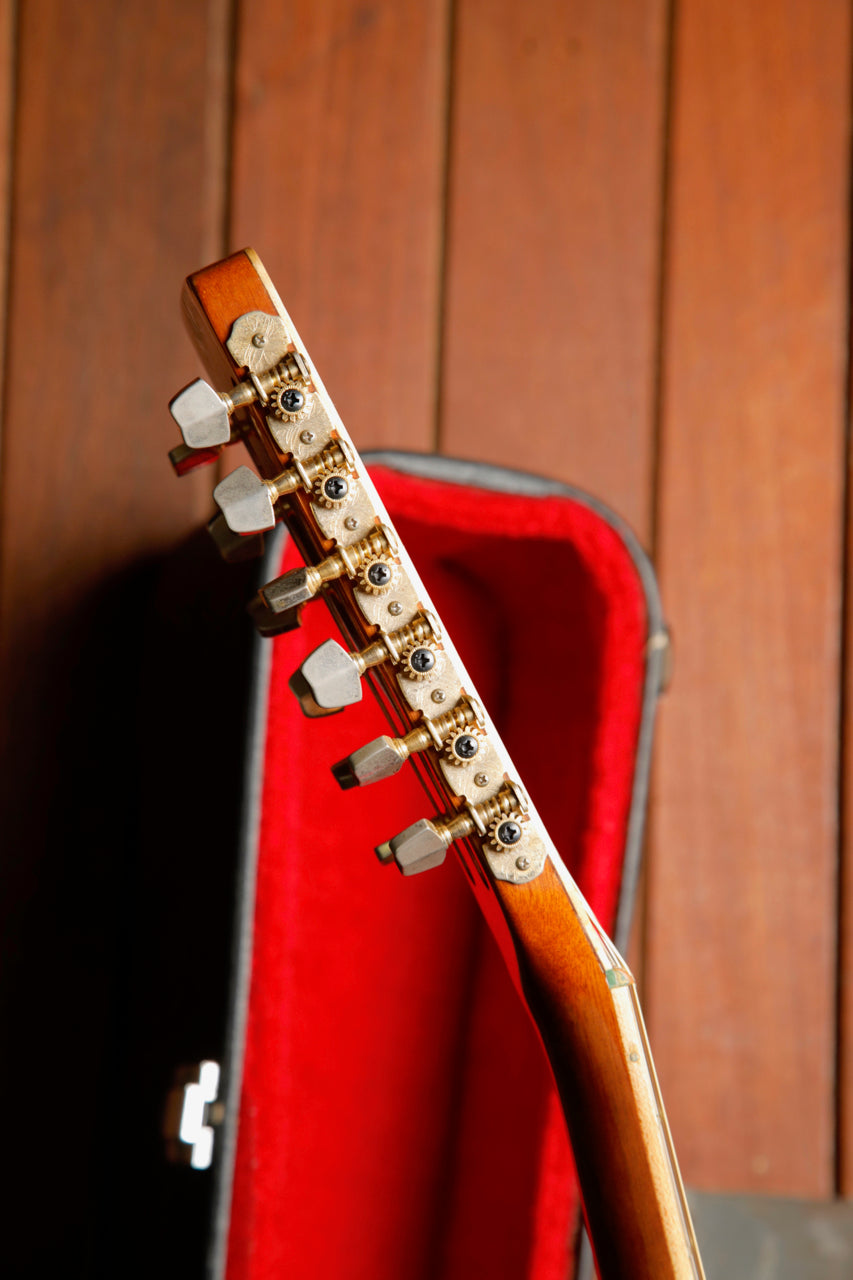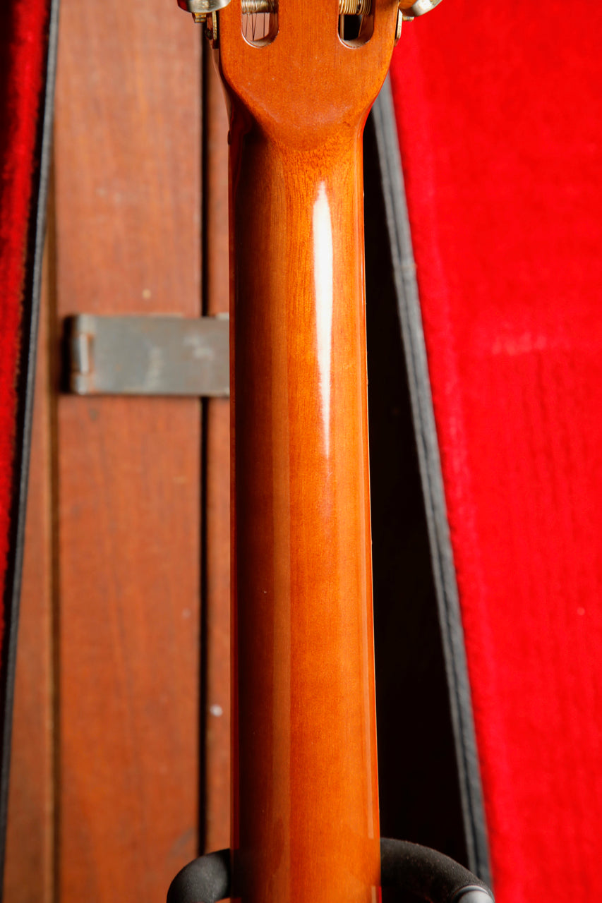 There are some signs of wear and age including small marks/dings and patina to the hardware including the brass nut and saddle. The frets also show a small amount. ofwear consistent with age.