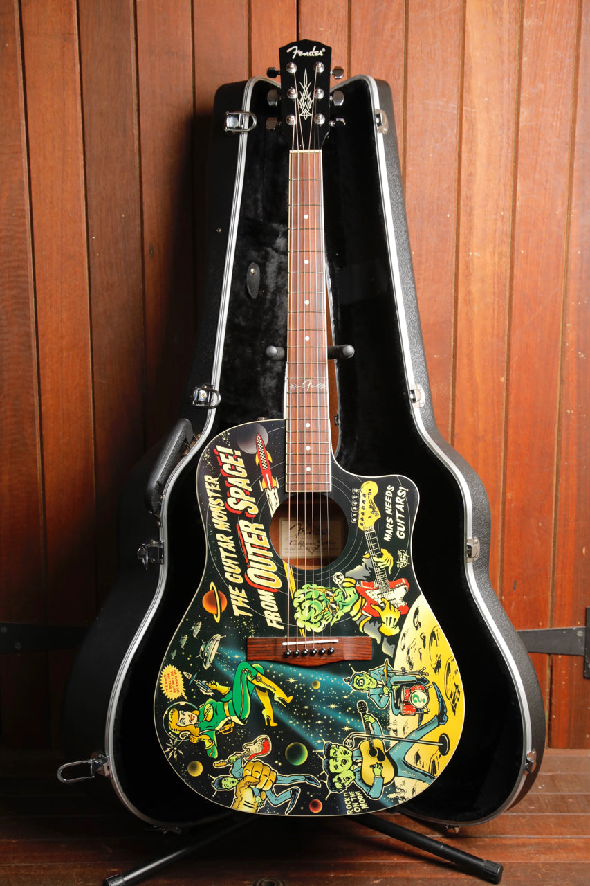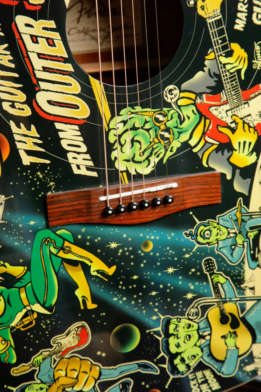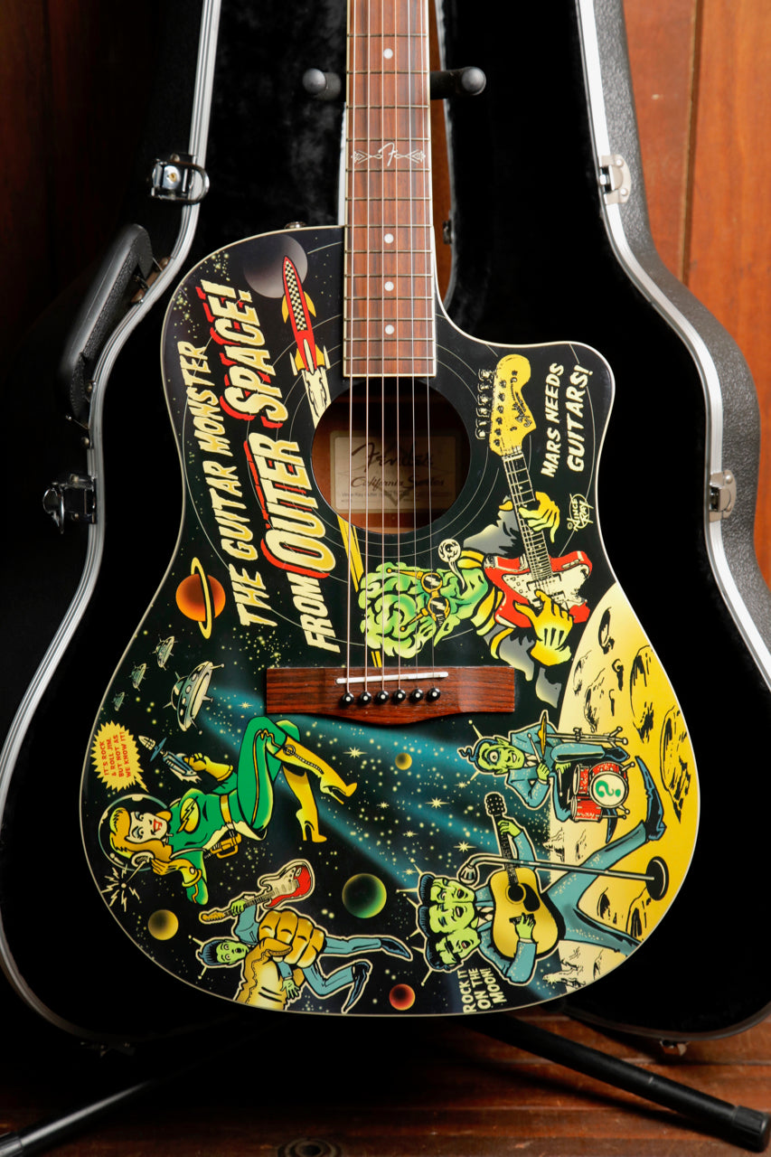 Fender and acclaimed hot rod artist Vince Ray are at it once again for one of their most deranged custom collaborations yet. From Ray's mad genius comes the Vince Ray Outer Space Bucket acoustic, which once again puts the "dread" in "dreadnought" with fantastical '50s-era horror comic imagery. This time, it depicts two twisted themes - otherworldly 'Guitar Monster from Outer Space" graphics on the front and Frankenstein-esque "Guitar Creature" graphics on the back. It's a terrific piece for any guitar arsenal and any Vince Ray collection, with other fine features including a convenient cutaway, resonant spruce top and mahogany back and sides, smooth-playing mahogany neck, onboard Fishman® electronics for superb amplified performance, and more.