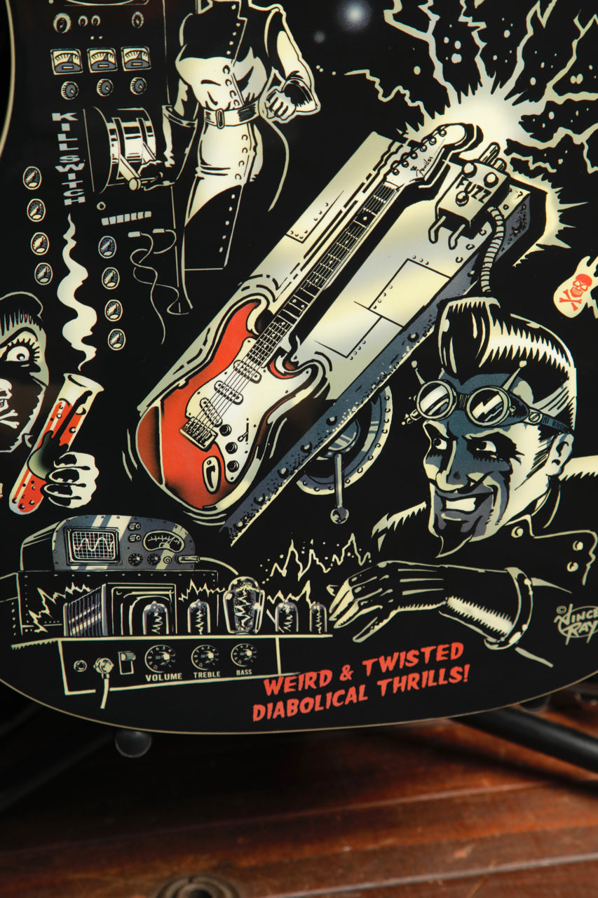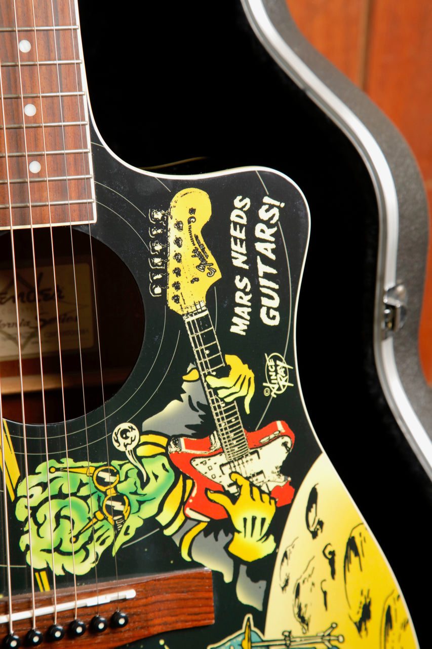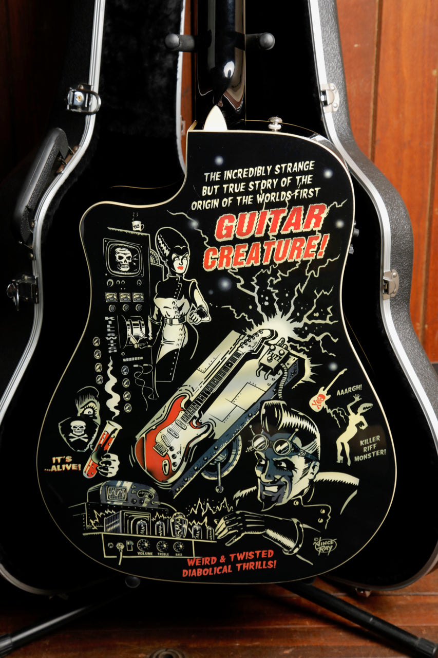Fender and acclaimed hot rod artist Vince Ray are at it once again for one of their most deranged custom collaborations yet. From Ray's mad genius comes the Vince Ray Outer Space Bucket acoustic, which once again puts the "dread" in "dreadnought" with fantastical '50s-era horror comic imagery. This time, it depicts two twisted themes - otherworldly 'Guitar Monster from Outer Space" graphics on the front and Frankenstein-esque "Guitar Creature" graphics on the back. It's a terrific piece for any guitar arsenal and any Vince Ray collection, with other fine features including a convenient cutaway, resonant spruce top and mahogany back and sides, smooth-playing mahogany neck, onboard Fishman® electronics for superb amplified performance, and more.