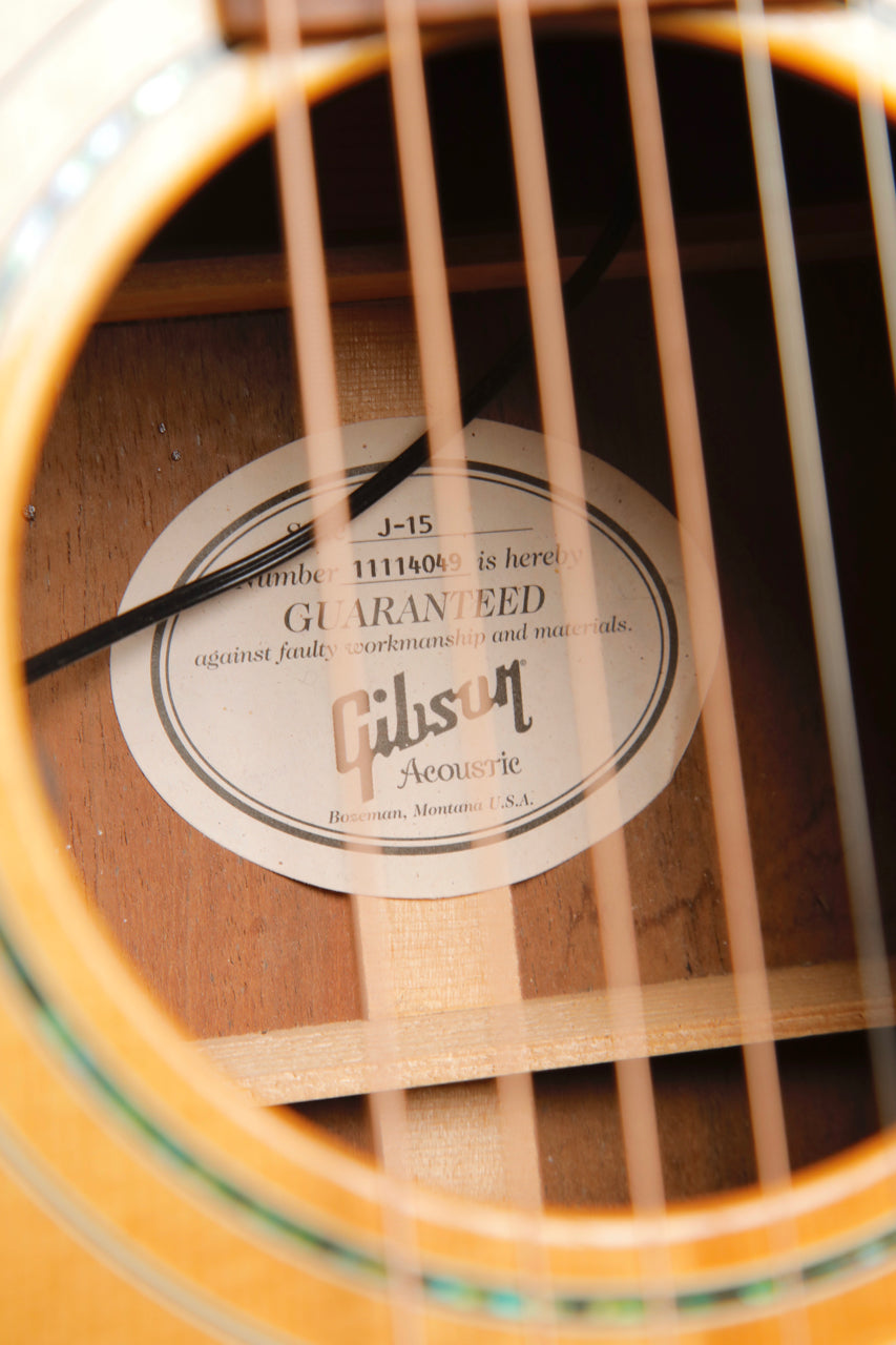The Gibson J-15 is hand-built in Bozeman, Montana with the same time-tested luthiery techniques that make our guitars the most sought-after instruments in the world. This impressive guitar features a dovetail neck-to-body joint secured with hide glue, scalloped bracing, and a hand-sprayed nitrocellulose lacquer finish.