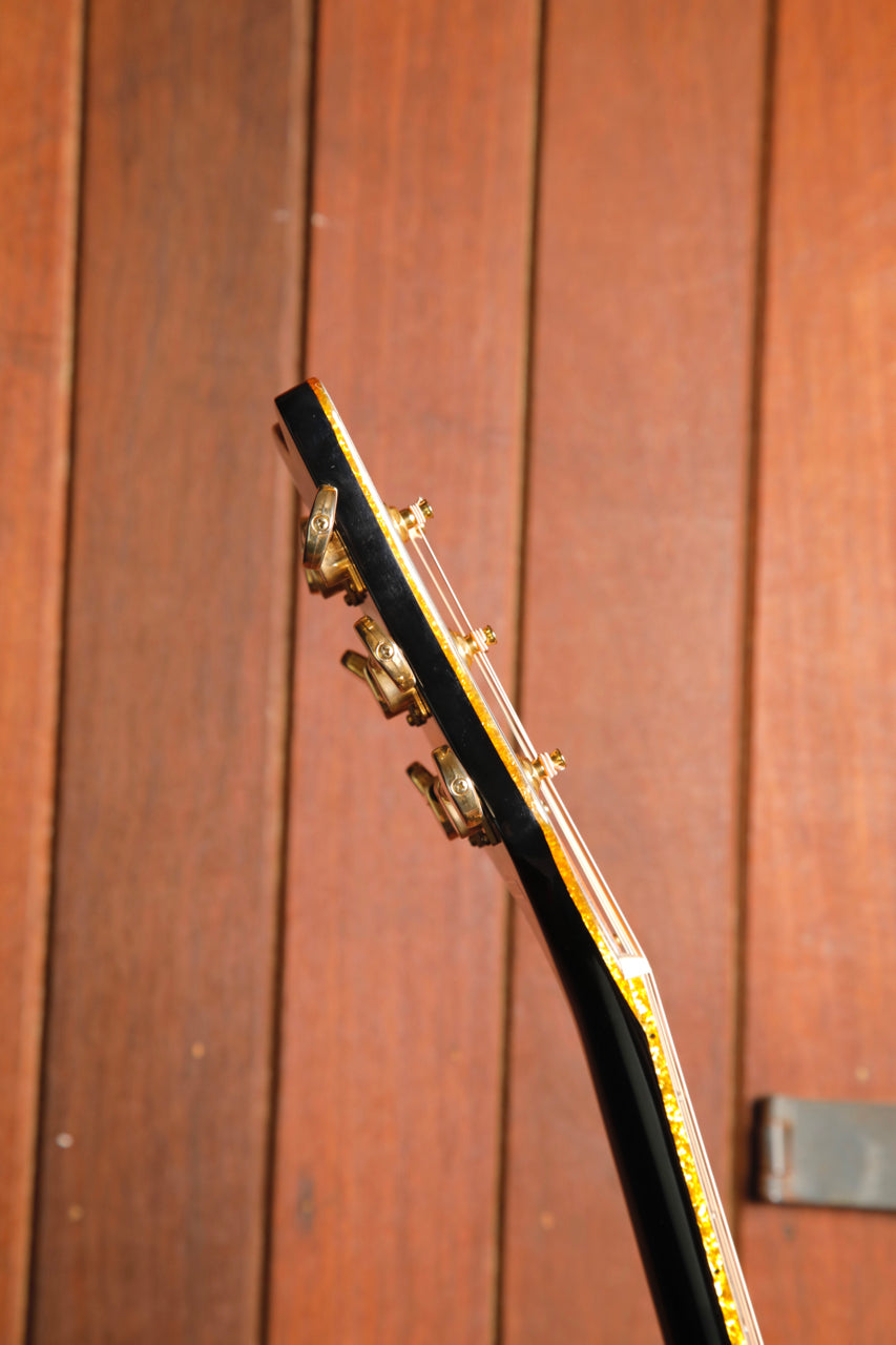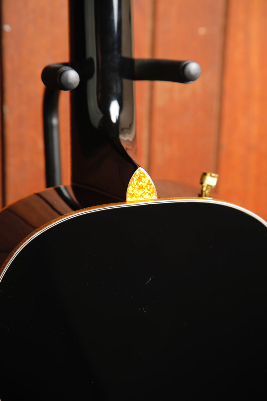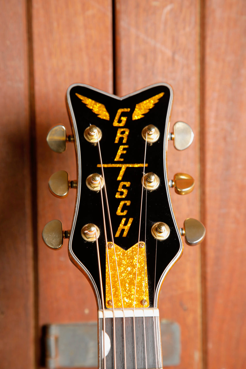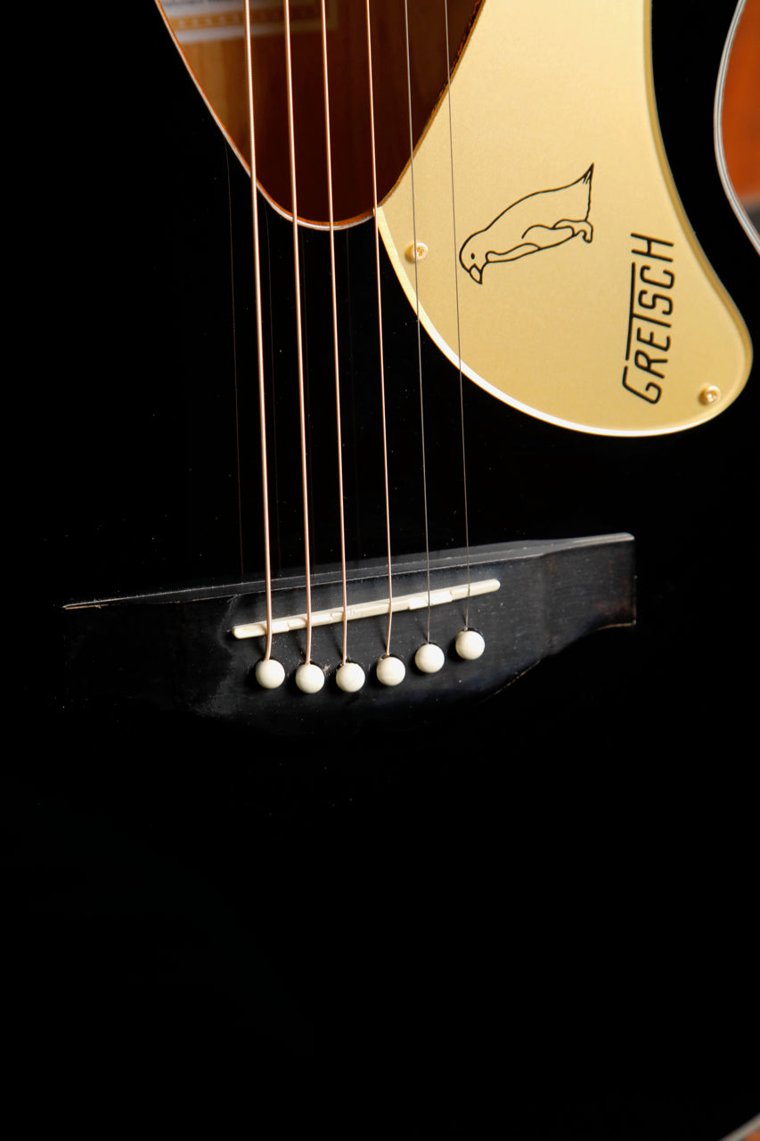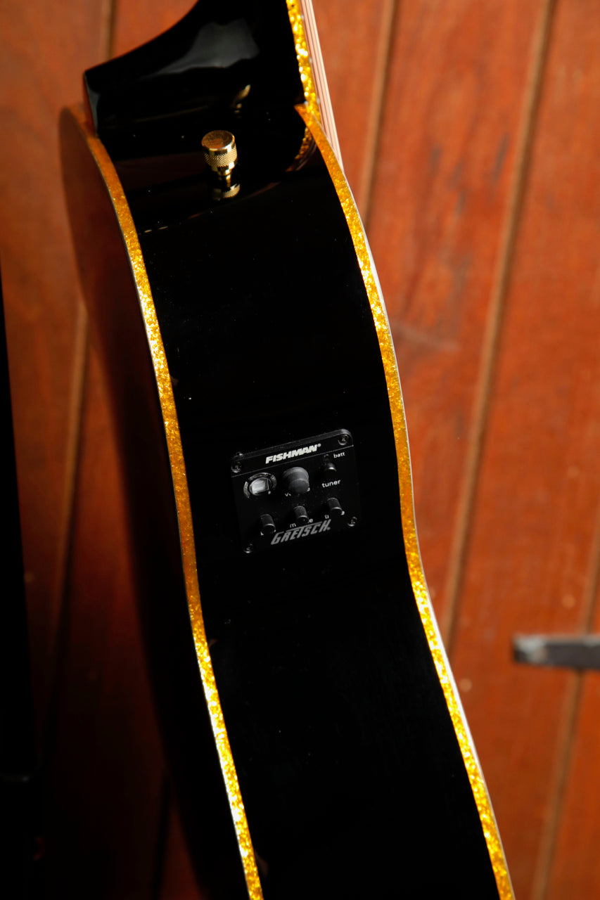 The Fishman® Presys III pickup/preamp system provides a modern sonic complement to classic touches including a solid spruce top with maple back and sides, mahogany neck, 12"-radius laurel fingerboard with 20 vintage-style frets, pearloid Neo-Classic™ thumbnail inlays and synthetic bone nut, laurel bridge, gold sparkle binding and vertical wing" Gretsch headstock logo, gold plexi pickguard, gold hardware, and more.
