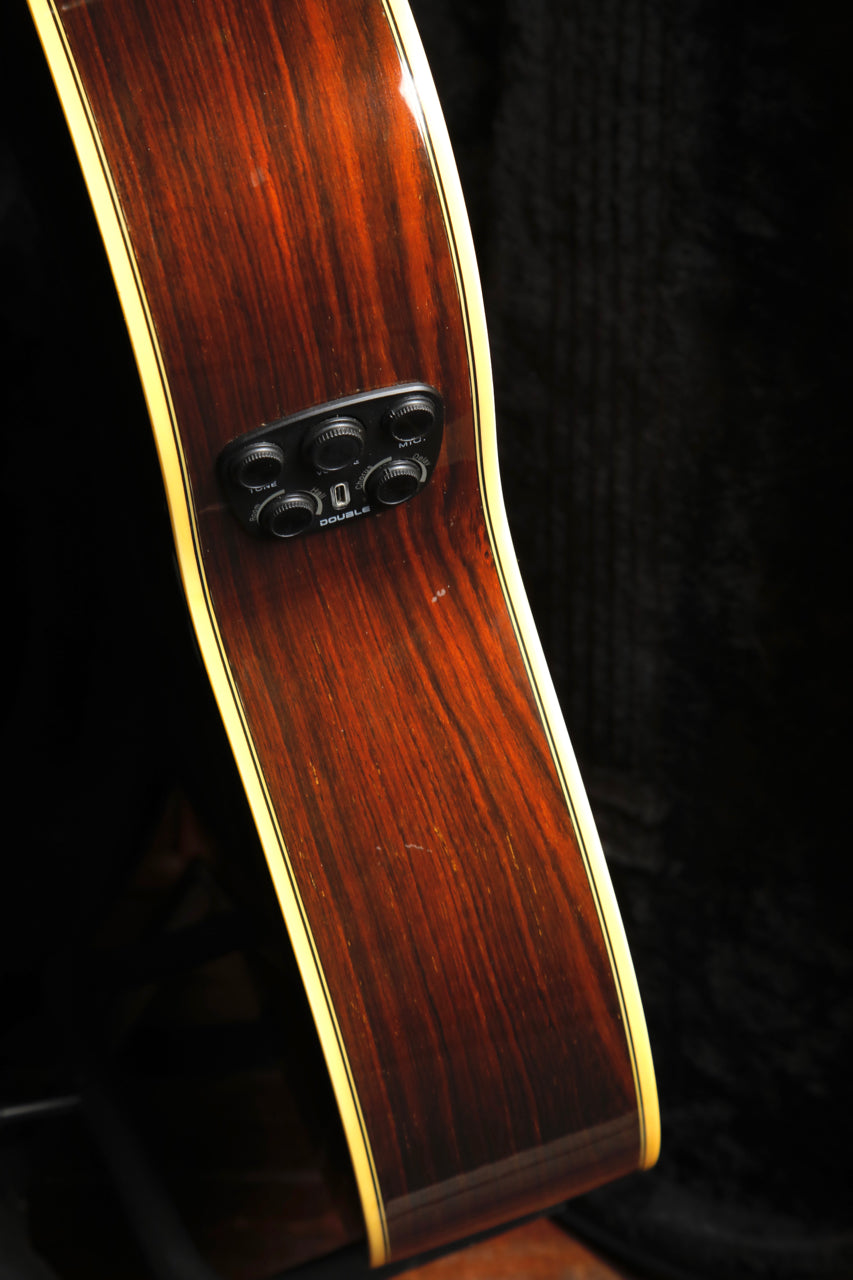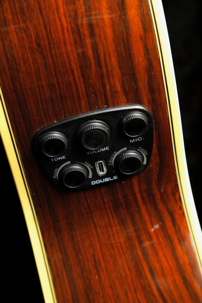 4. I Have installed the trans-acoustic system, which amplifies the guitar without using an amplifier. The system also has built-in effects, eliminating the need to carry pedals and power supplies to gigs. The system is powered by a good quality 18650 rechargeable lithium-ion battery which can last for many hours. The system has two pickup sources: 1. high-quality piezo-electric pickup under the saddle and a condenser microphone to capture the warmth of the acoustic sound as well the percussive sounds for loop-pedal players.