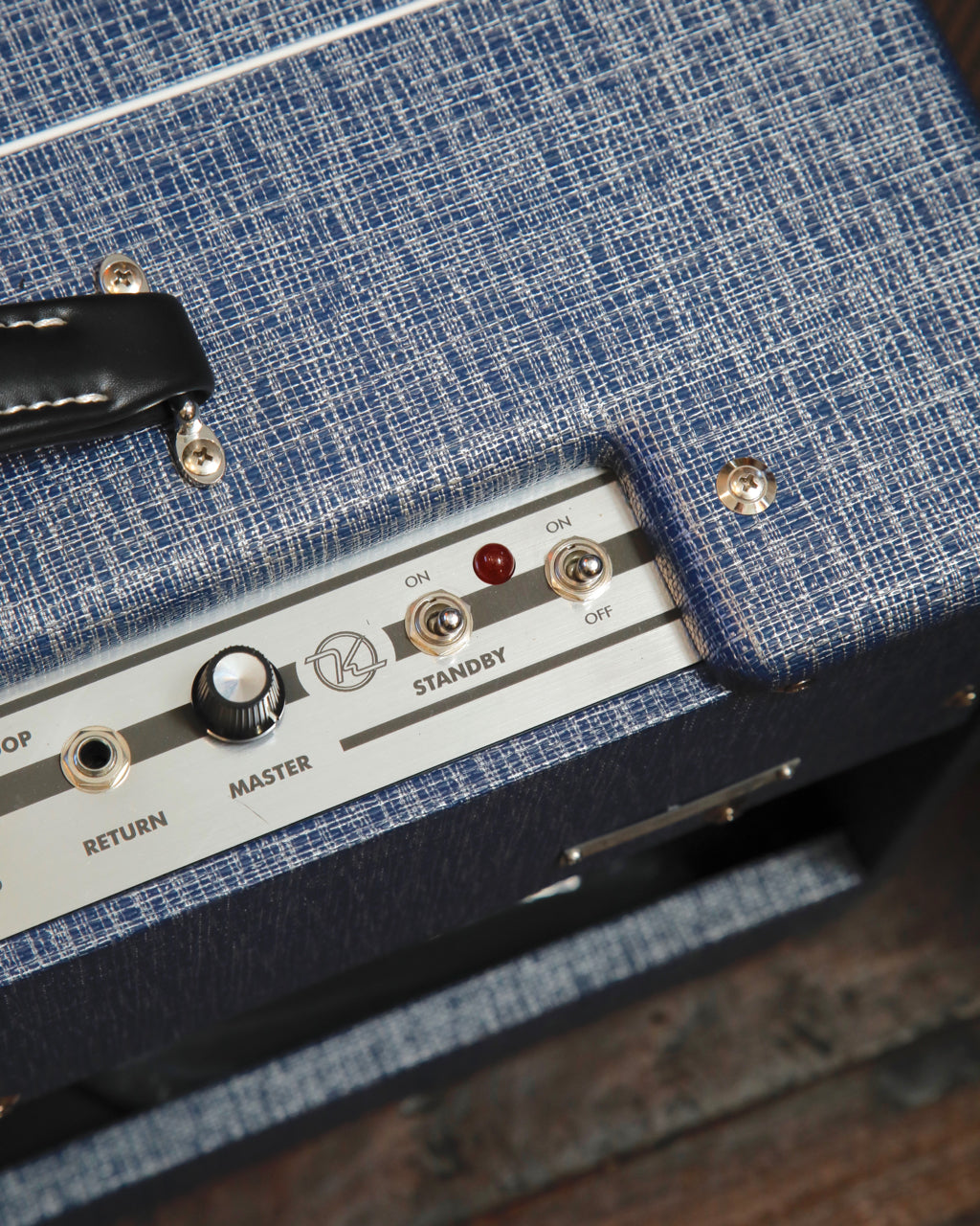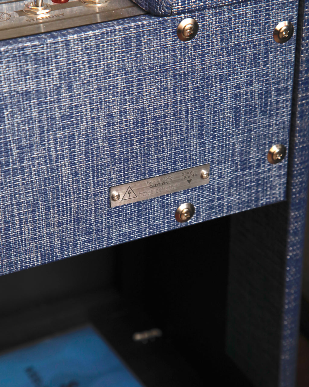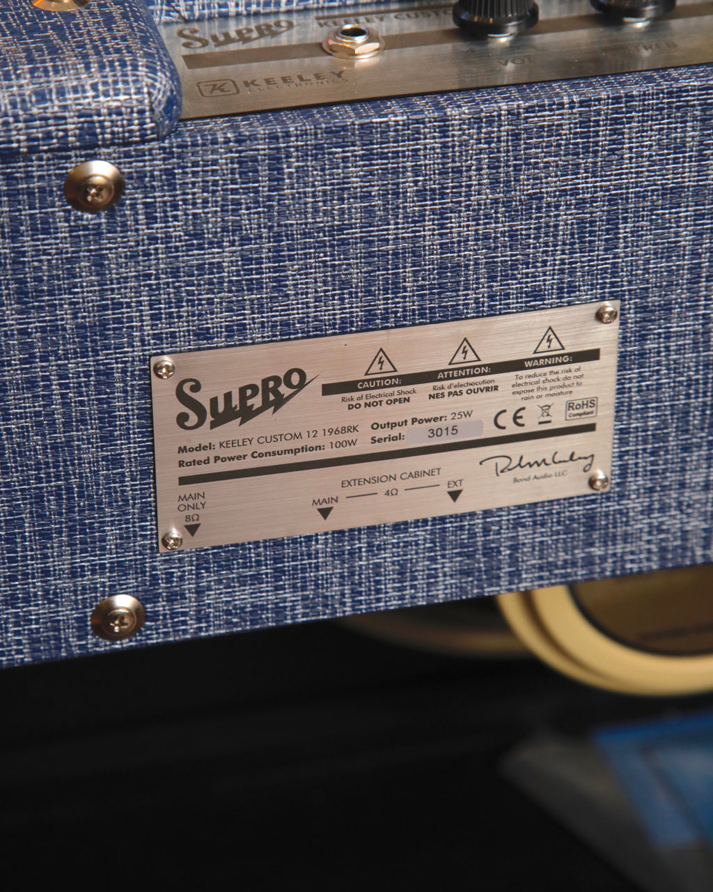 Custom Blue Rhino Hide tolex, our Supro Silver/Blue grill cloth, white piping, a dog bone handle, and engraved headplate co-branded with Supro and Keeley Electronics identities.