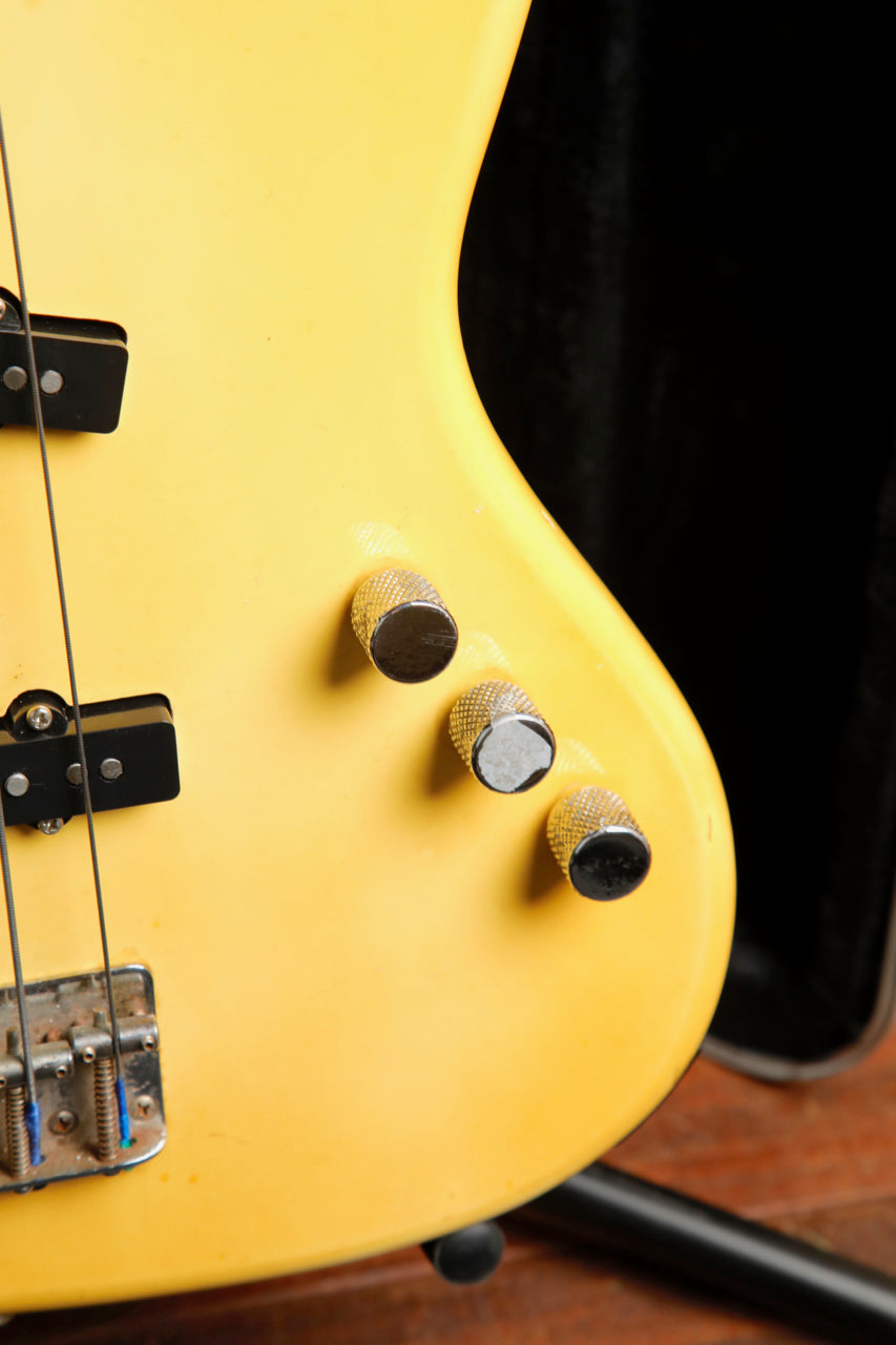 This bass shows some signs of wear and modification but is playing beautifully, currently setup with flatwounds. There are some marks, scratches and patina consistent with age and the original pickups have been replaced with toneriders. The frets are in great condition for its age with only a small amount of wear.