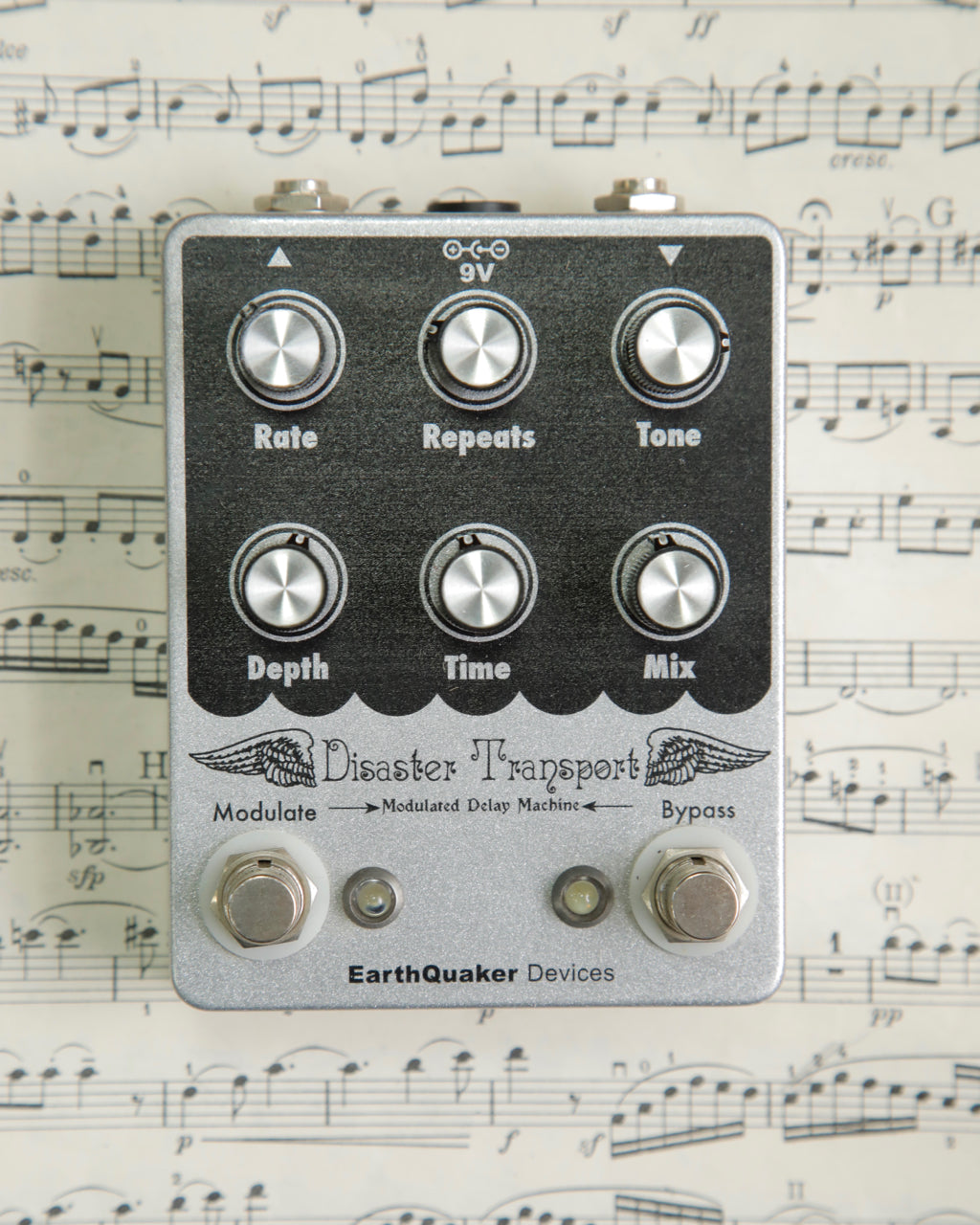 The Disaster Transport is an analog voiced digital delay with 625ms delay time, all analog dry signal path, true bypass and added modulation. It was designed as an anti-modern delay for those who appreciate a nice tape echo with all its peculiarities. Its unique tone control doubles as a noise filter on longer delay settings and really helps the delay shine with a dirty signal. The mix control allows you to boost the effected signal to nearly 4x the original signal level and the modulation can go from subtle pitch shifting warble to ultra fast tremolo speeds while the LED visually shows the rate.