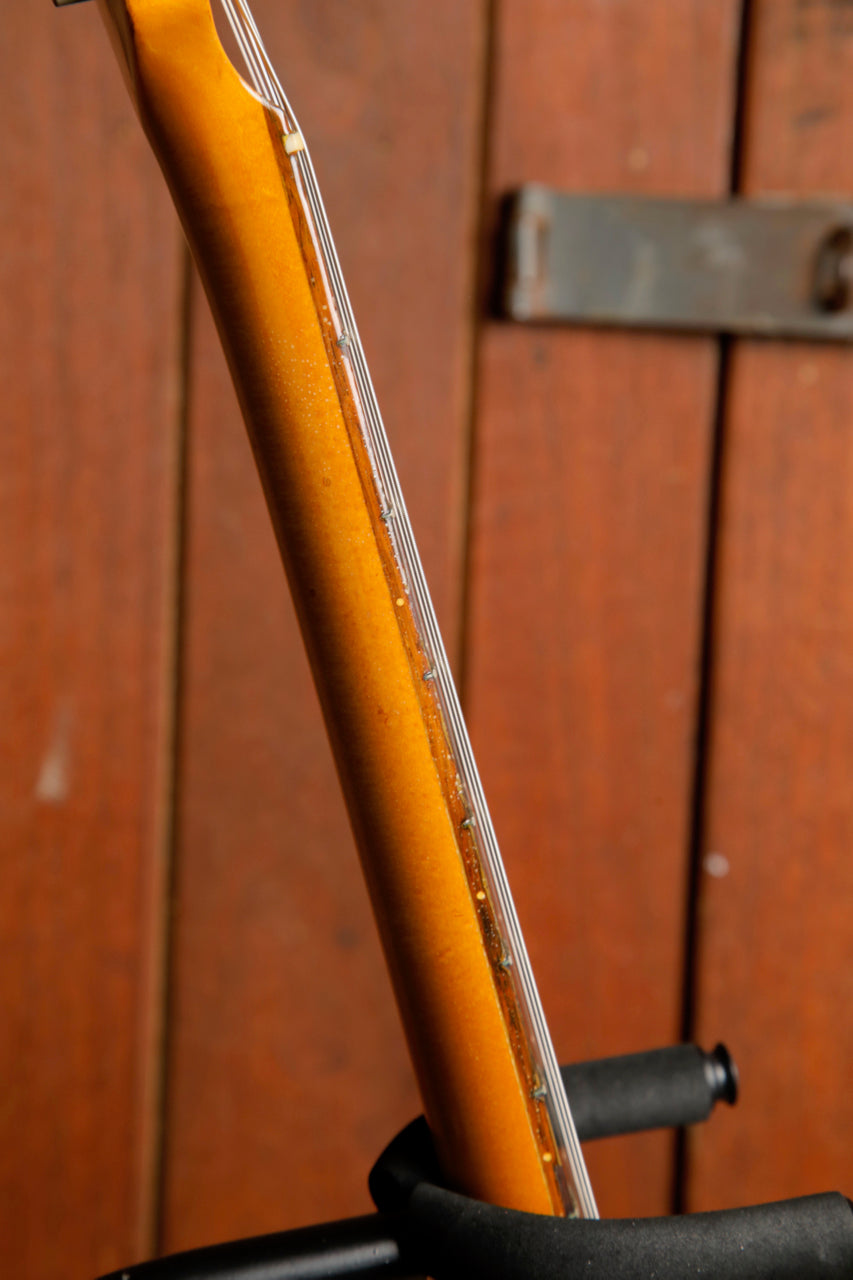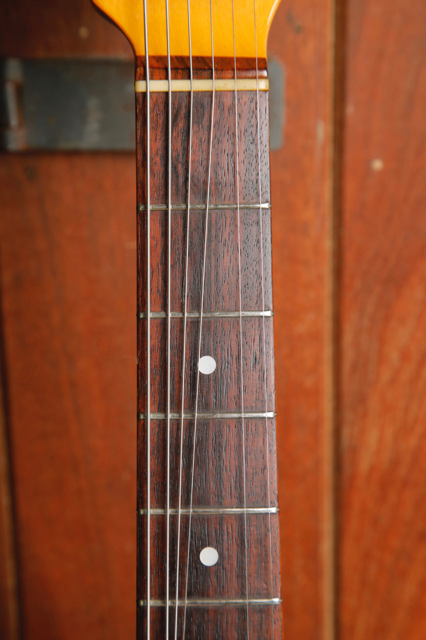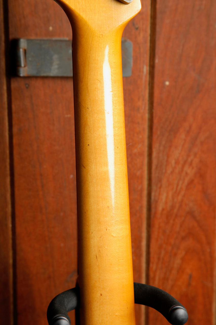 There are signs of wear including scratches/dings with a large ding on the body carve (as pictured). There are also a few splits in the back plate from over tightened screws. The finish and pickguard have faded and aged which looks awesome and the frets feature some wear with a lot of life left in them.