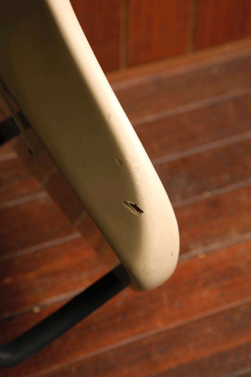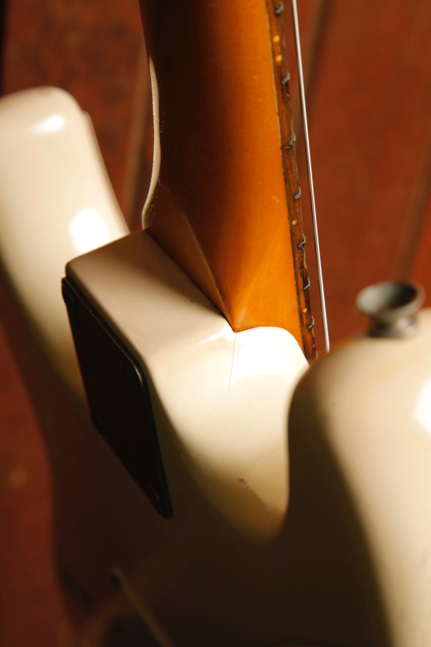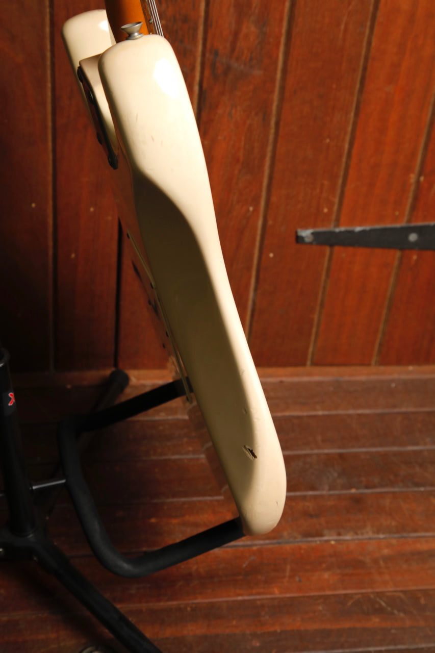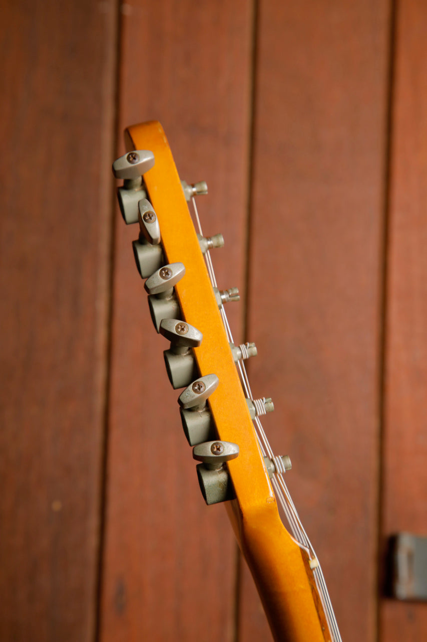 There are signs of wear including scratches/dings with a large ding on the body carve (as pictured). There are also a few splits in the back plate from over tightened screws. The finish and pickguard have faded and aged which looks awesome and the frets feature some wear with a lot of life left in them.