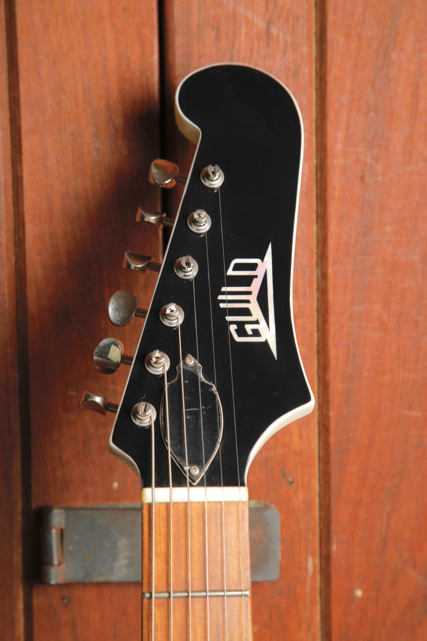 "The Guild Jetstar embodies the ultimate retro vibe with a unique body shape that’s been off the grid since the 1960s. In terms of style, this reissue remains faithful to the first iteration of the S-50 Jetstar with a solid mahogany body and set neck. Further period-correct details include six inline tuning machines and Guild’s rare pearloid pyramid logo on a scroll-shaped headstock.