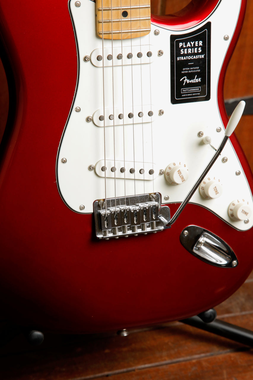Pre-owned in very good condition, this Fender Player Series Stratocaster is finished in a very nice Candy Apple Red. This guitar also features a maple neck and fretboard with a 2-point tremolo system.