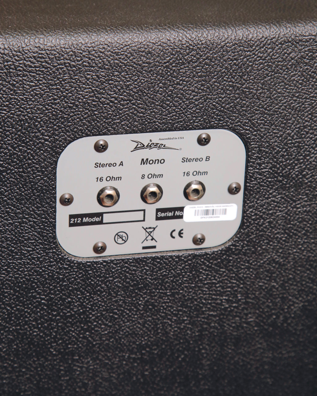 The Diezel-212FK is a front loaded 2x12" cabinet loaded with G12K-100 Celestion speakers. This cabinet is constructed of Multi-ply Baltic birch construction which delivers a tighter and more focused sound, adds overtones to the frequency range and is ideally suited for heavier playing styles. This cabinet includes two 16 ohm stereo connections or one 8 ohm mono connector.