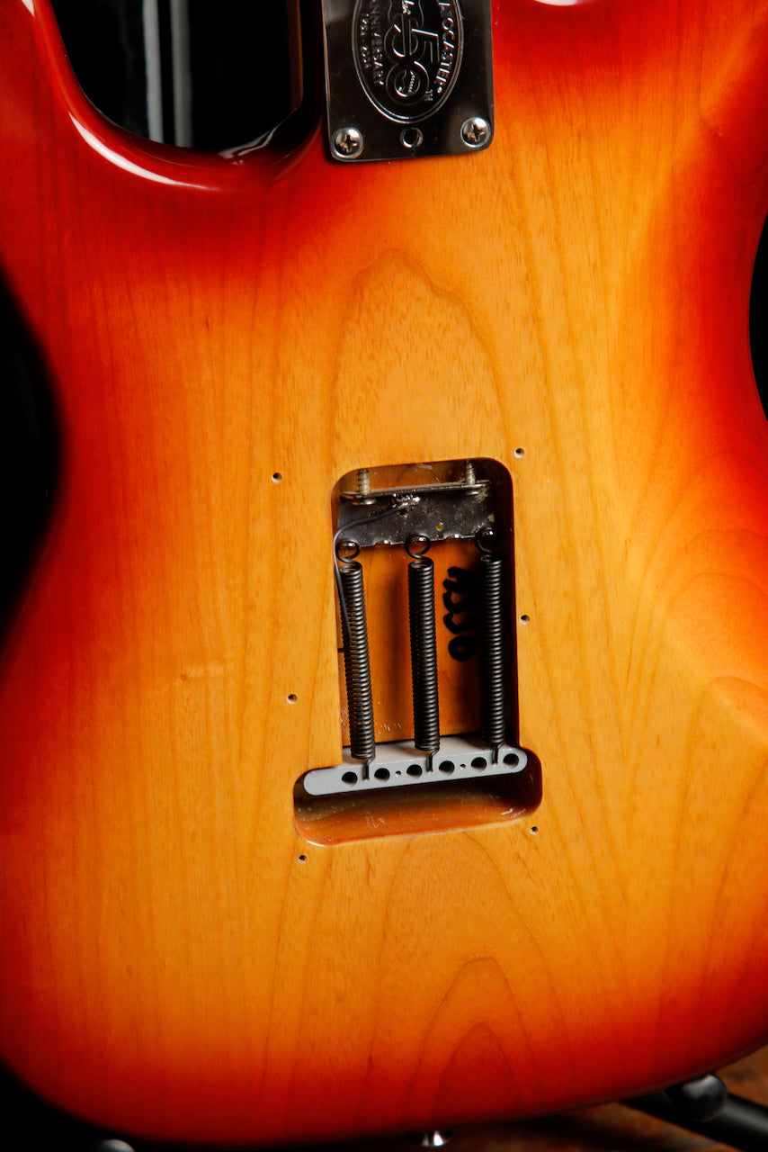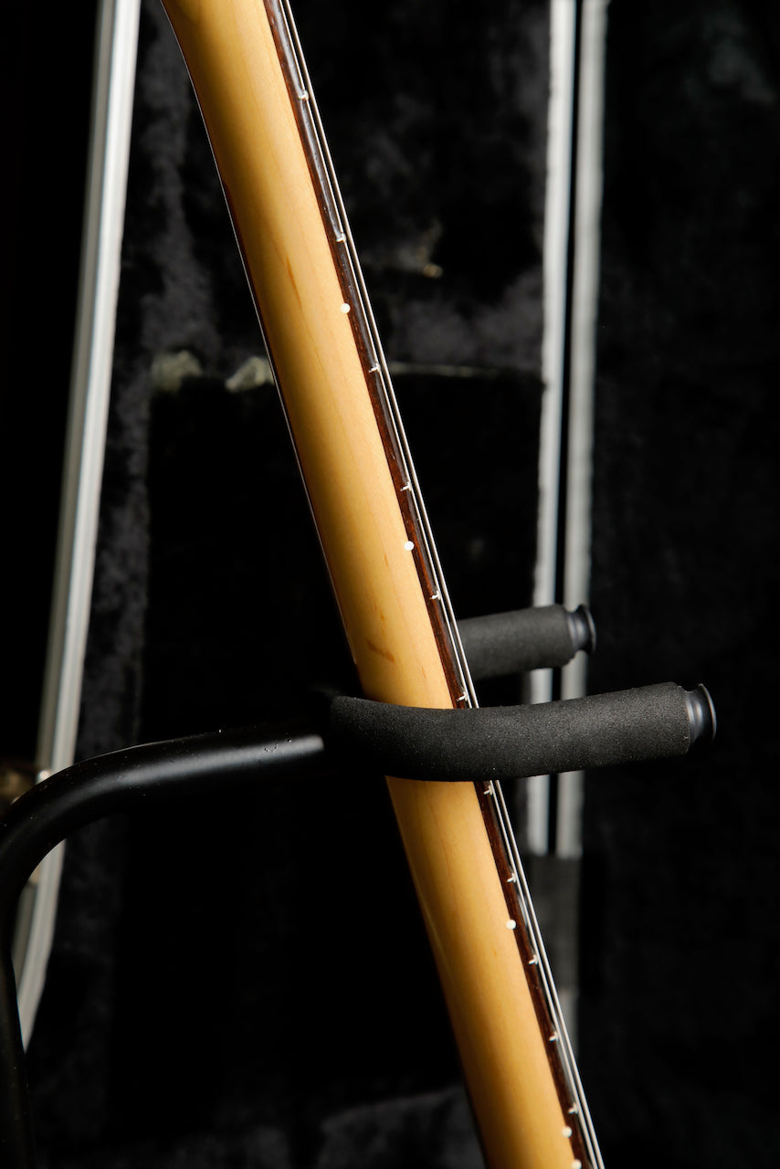 This guitar presents very well with some tiny marks and wear from light use. The input jack has also been replaced and the back plate is missing. The frets are in excellent condition with minimal wear and it is playing great after a setup.