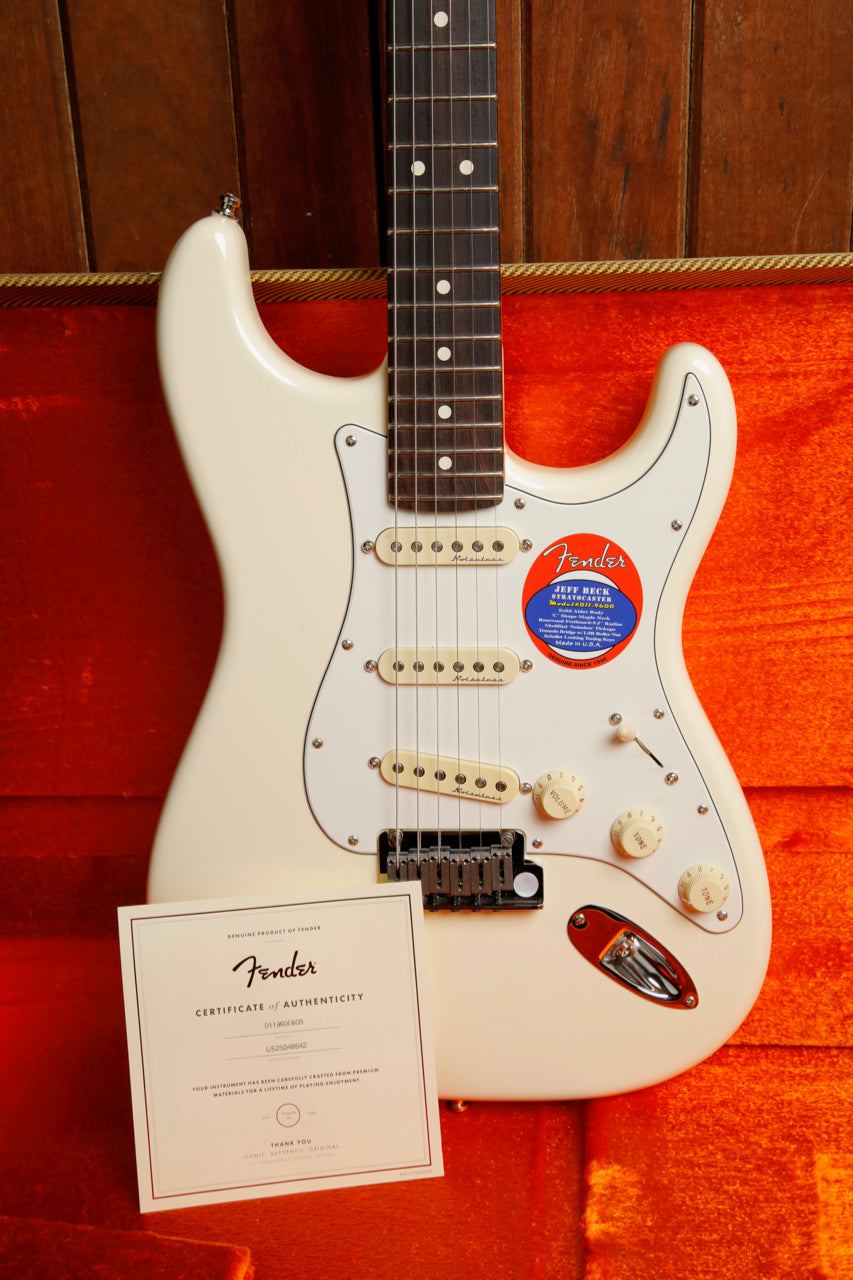 Here's a fantastic find for the Jeff Beck fanatic! This Jeff Beck Stratocaster is finished in an Olympic White and fitted with a set of Fender's Hot-Noiseless Single-Coil pickups.