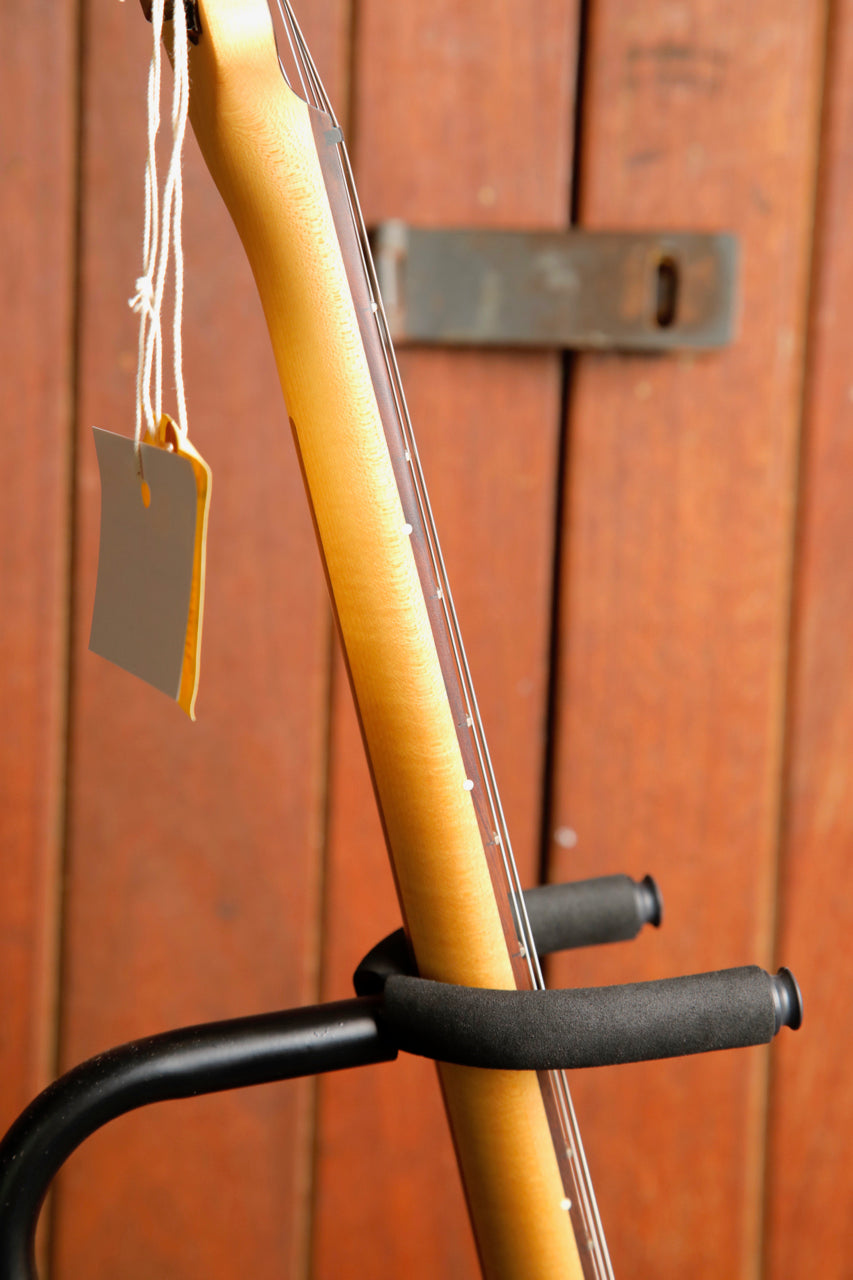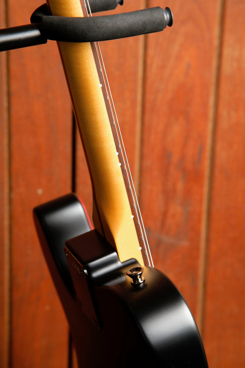 The 3-ply black pickguard with a striking red centre layer, paired with the red metal logo on the headstock, creates a unique look. All metal and plastic parts are black, with a black colour Synthetic Bone nut to complete the look.