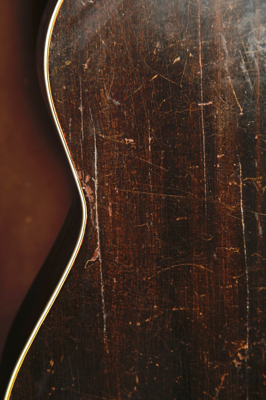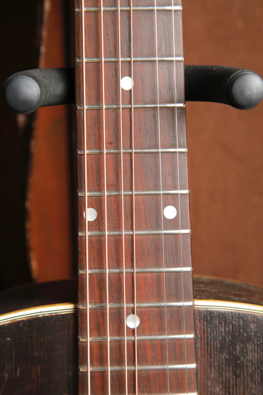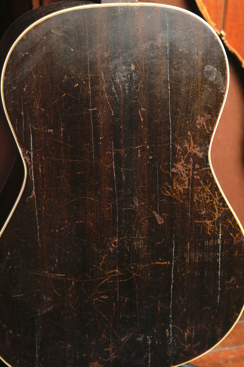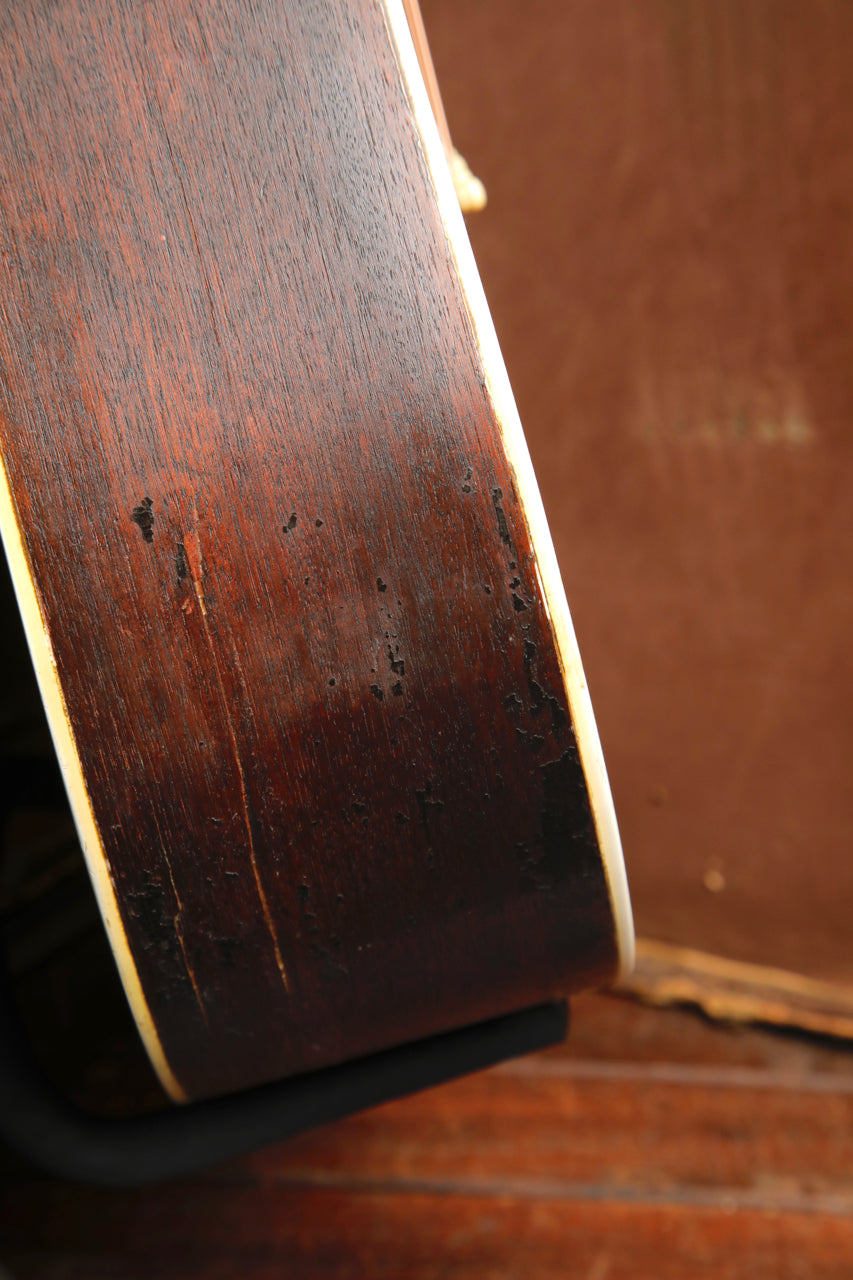 This guitar has just received a professional neck reset, partial refret/crown & dress and a full setup with a new saddle so it is playing beautifully! There has been previous splits repaired on the back & sides of the guitar as well as a previous bridge repair.