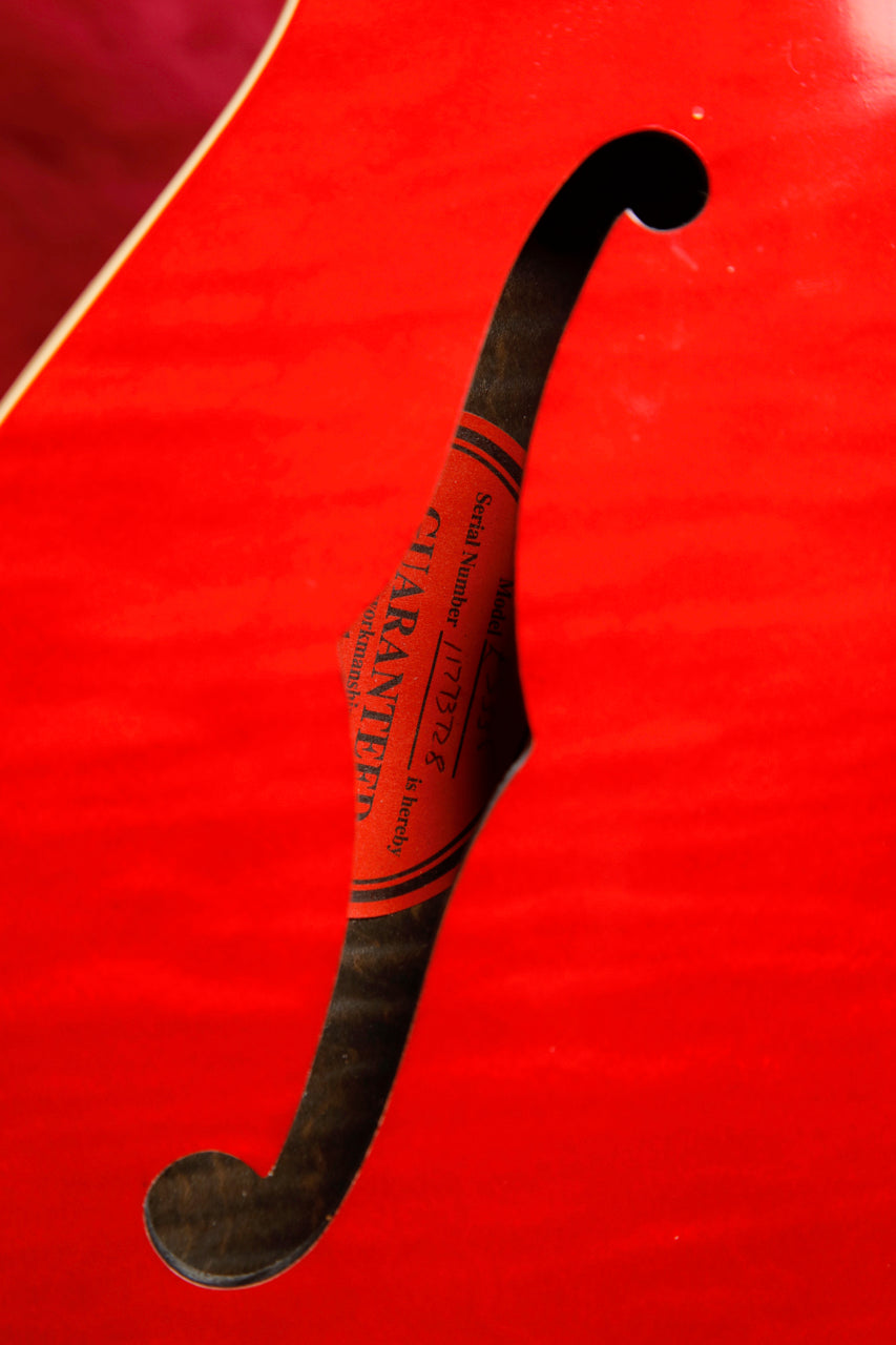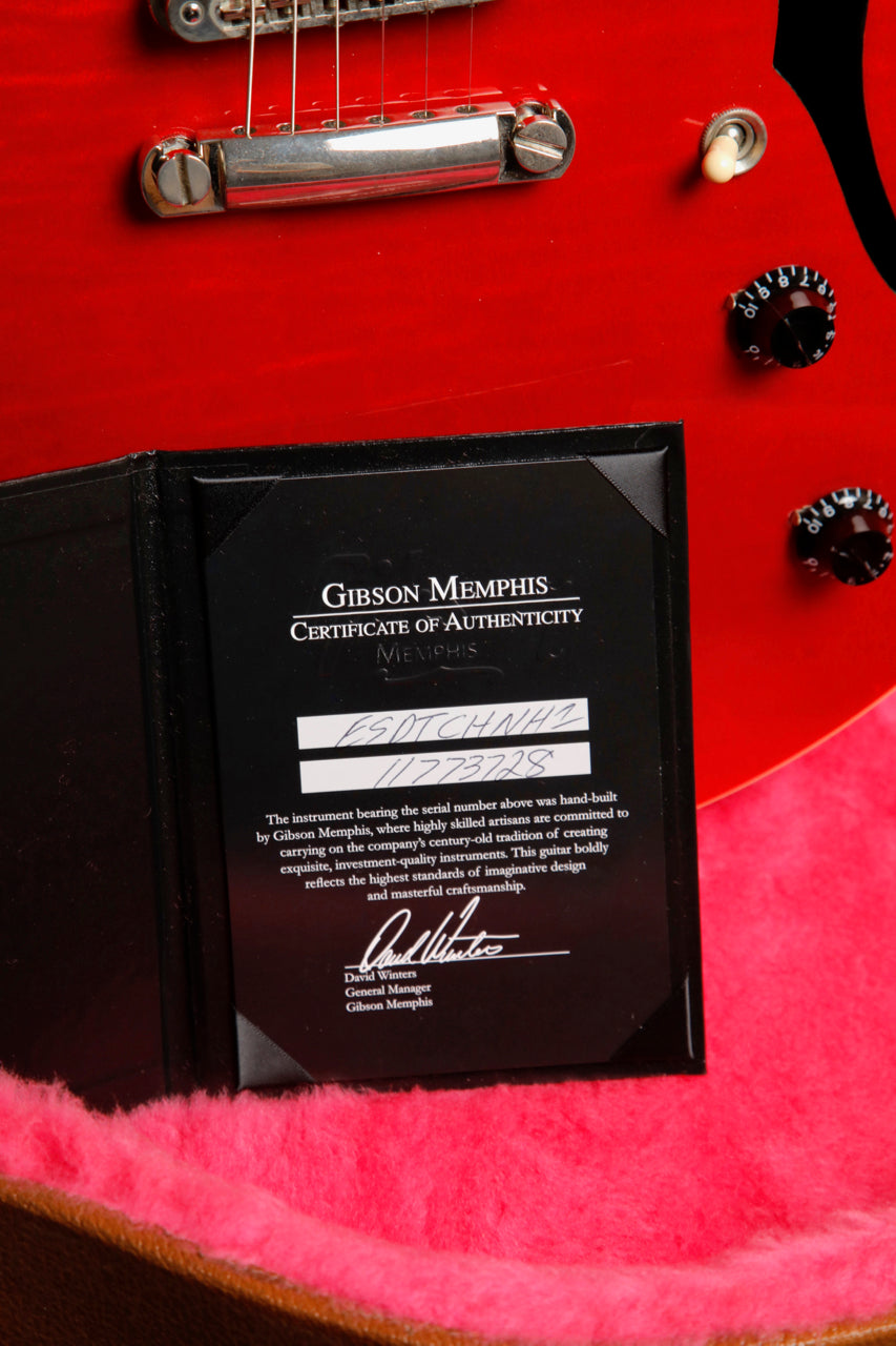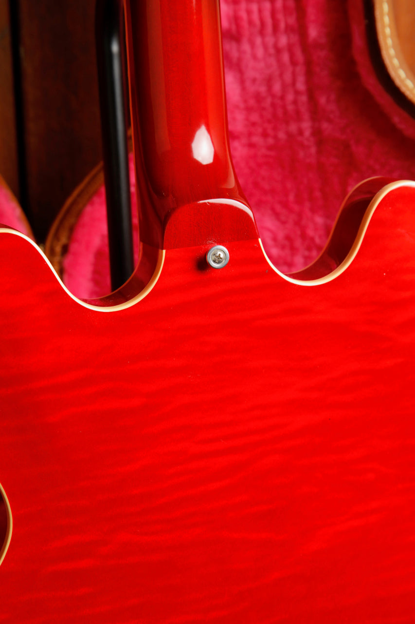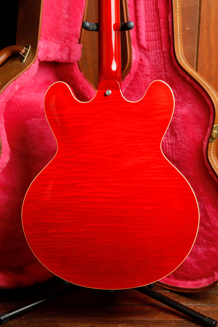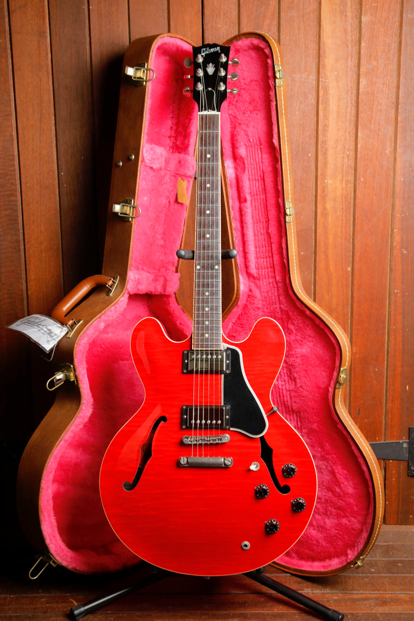 Here we have a stunning Gibson ES-335 Dot in a Figured Cherry finish! This 2013 model was made in Gibson's Memphis factory and is in excellent pre-owned condition. Fantastic playability meets exceptional tones and beautiful finishing.