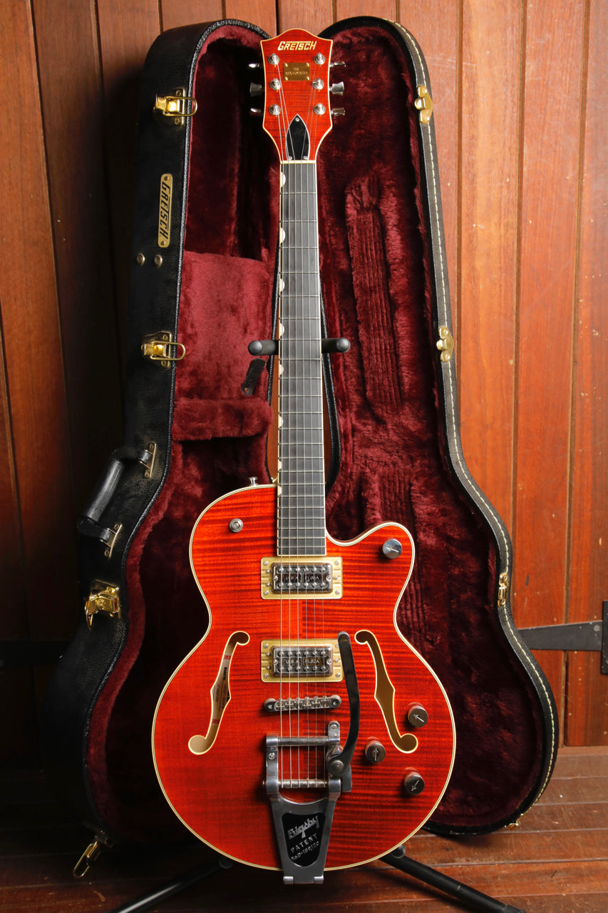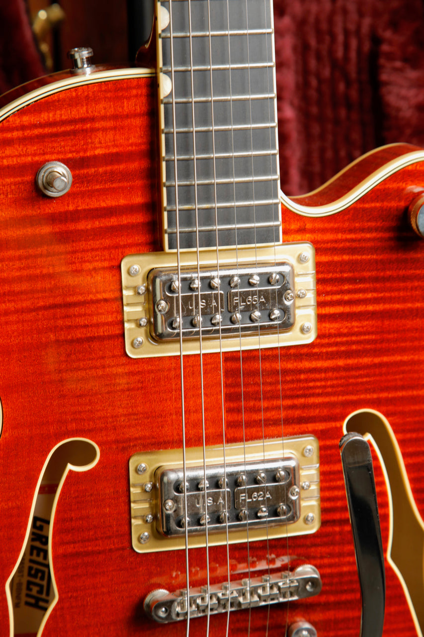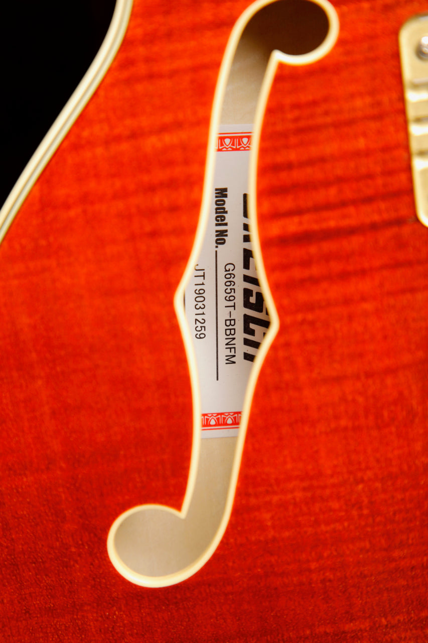 Pre-owned in excellent condition, this Gretsch G6659TFM Players Edition is finished in a lovely Bourbon Stain which lets its flame maple body peek through nicely. This guitar plays beautifully and sounds great with a pair of USA Full'Tron pickups.