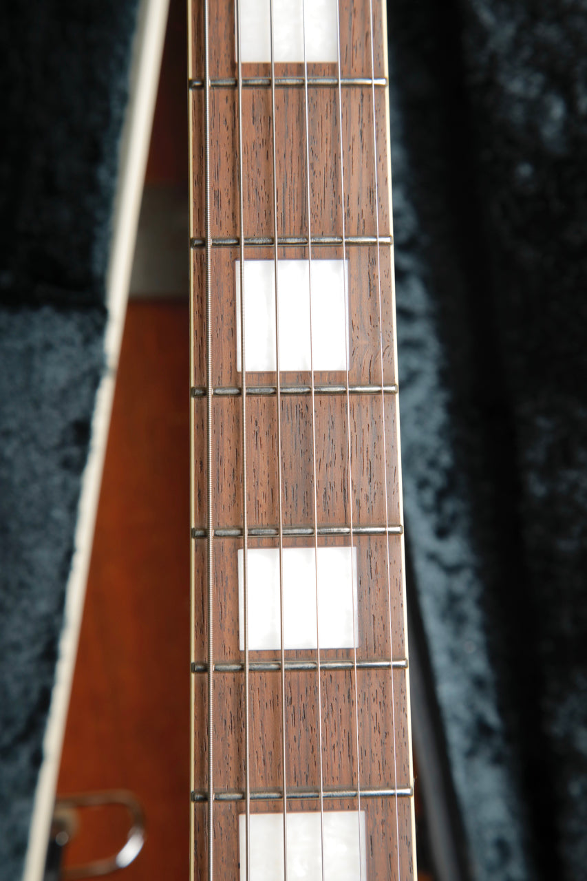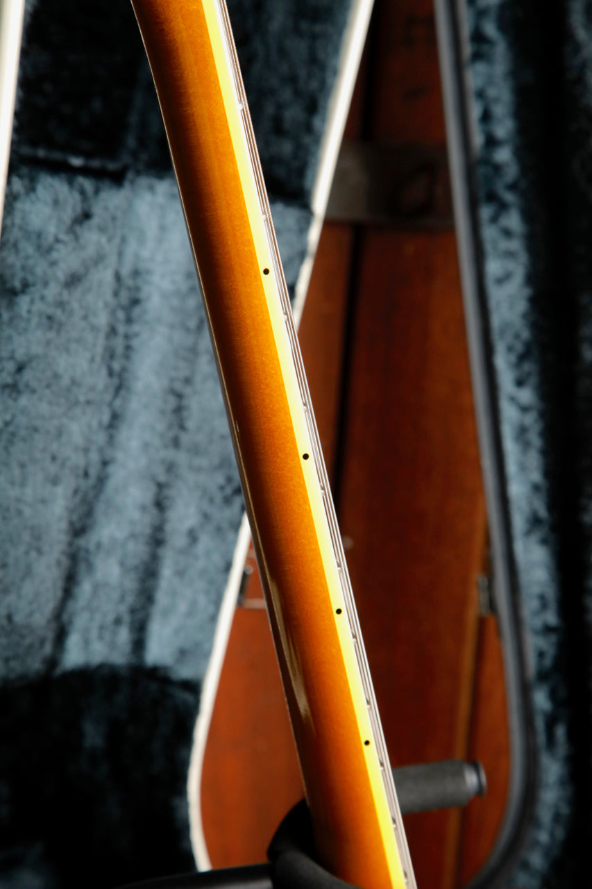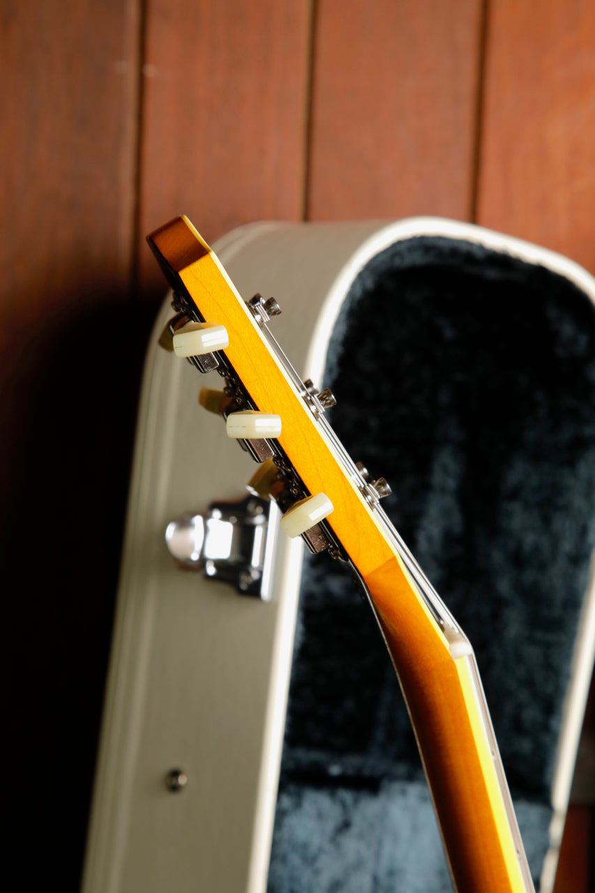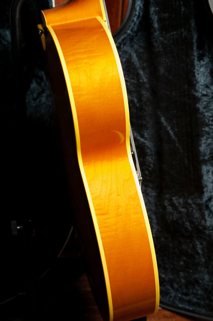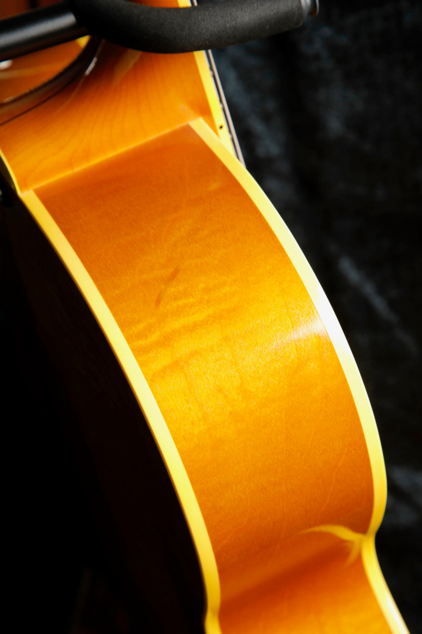 "This is the fully-hollow guitar with three P-90s that was used by R&R and BLUES musicians such as Carl Perkins, Lowell Fulson, and Goree Carter in their early days. The sound of T-Bone Walker, the father of modern blues, who attracted the likes of B.B. King, Chuck Berry, and Gatemouth Brown, and his acoustic yet crisp sound. We designed this guitar to have that sound. The neck and middle pickups are hand wired with less turns of wire to keep the bass from getting too boomy, and the bridge pickup is wound with a little more tension to keep the mid and low tones strong and crisp. The bridge pickup is wound with a little more tension and looser. The plywood has been layered to maximize the benefits of its nice tone. It has 3 P.U. controls with Toggle SW, 1 Master volume & 2 Tone (Front Tone, Middle & Bridge Tone). 2 P.U. and 1 P.U. models are available at the same time. The full body construction and the balance of the pickups make it easy to create the sound that the players mentioned above have left behind."