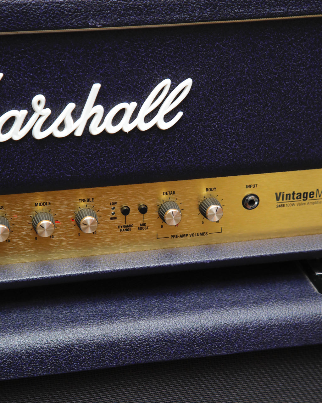 Here is an awesome find for the lover of classic Marshall tones! This Marshall Vintage Modern 2466 is in very good pre-owned condition and comes with its matching 425A speaker cabinet finished in a tasteful purple.
