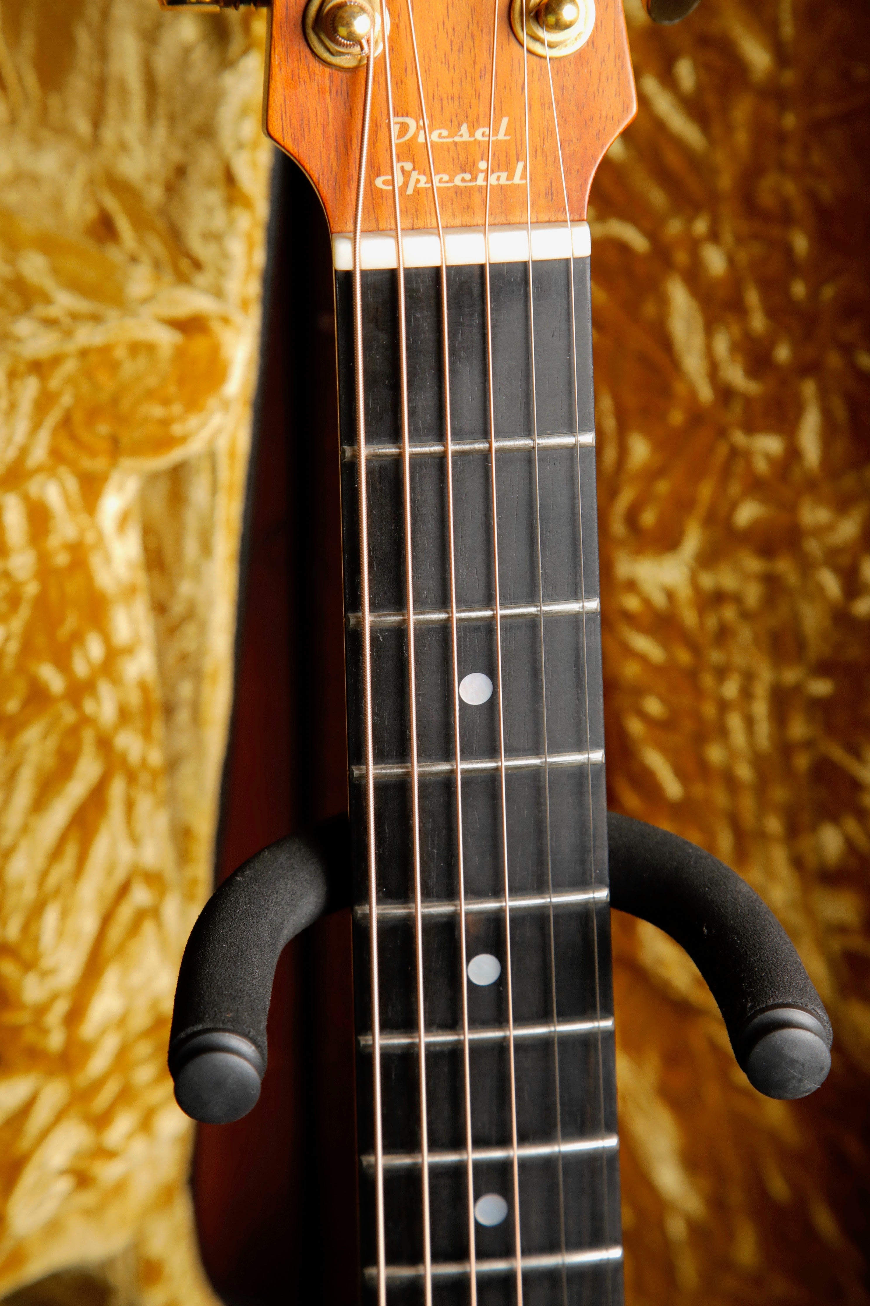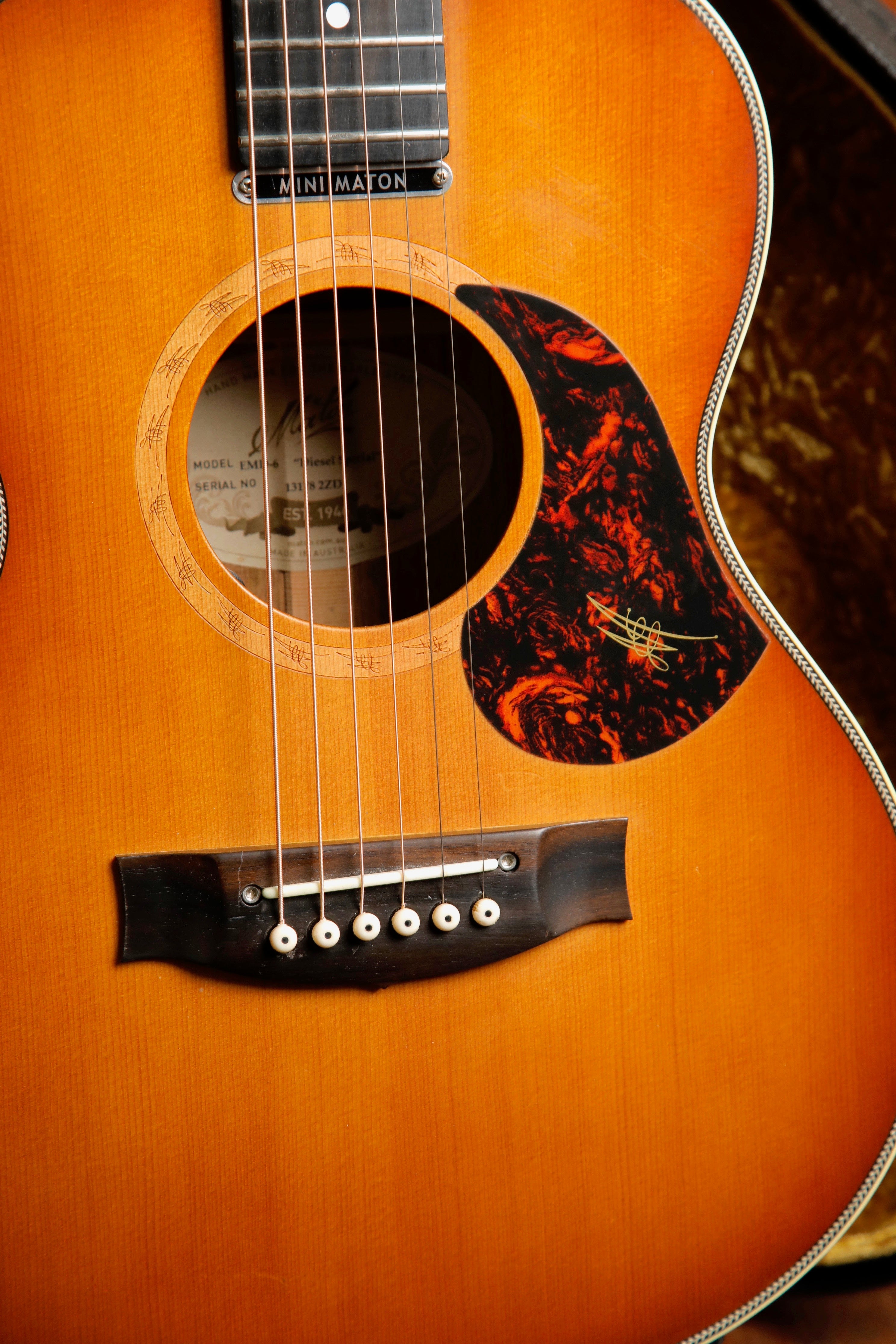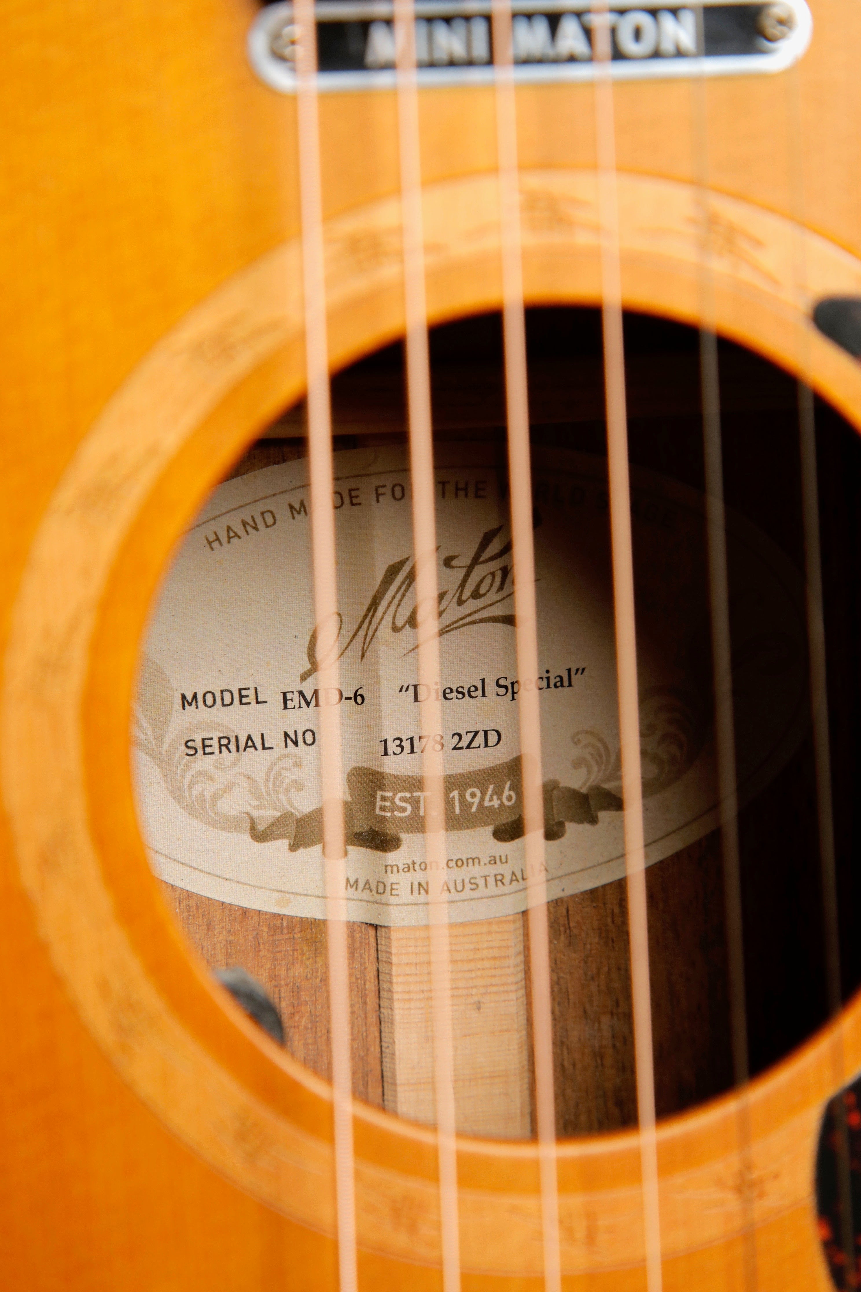 This model features a Sitka Spruce top, solid Blackwood back and sides, now with the AP5 PRO pickup system, gold Grover machine heads, and a Vintage Amber Stain. The Mini Maton Diesel Model can be purchased in 6 and 12-string configurations.