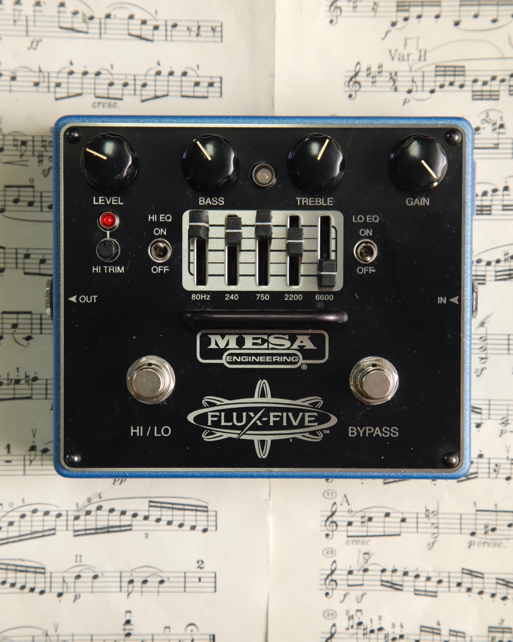 The Graphic EQ can be applied to both HI and LO Gain Modes enabling you to have a global EQ curve or apply it to either gain Mode separately to have two “preset” sounds with different EQ shapes and gain signatures to switch between. A HI TRIM pot allows the volume level of HI to be adjusted in relation to the original LO (FLUX-DRIVE) Mode. However you choose to utilize all this potential, the warm rich FLUX-FIVE overdrive is sure to inspire you and bring out your best.