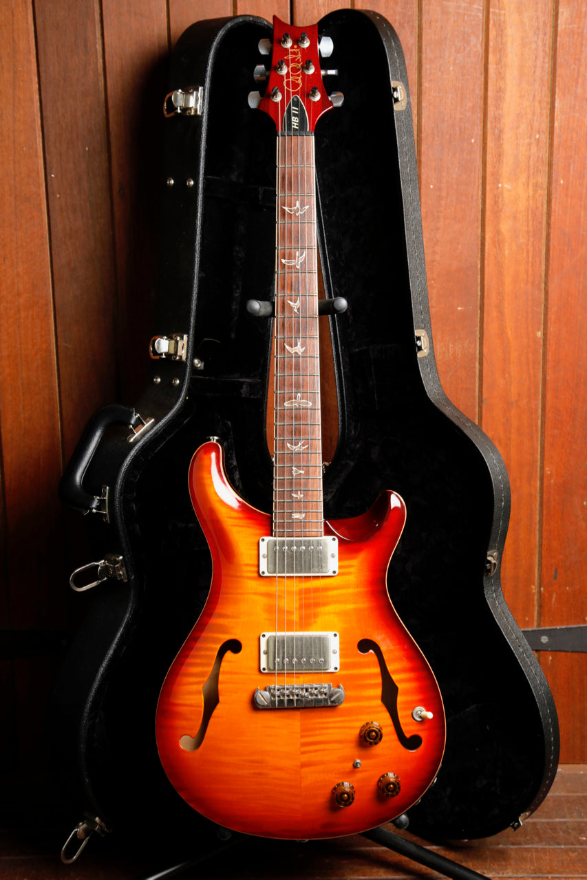 What a stunning guitar! This PRS Hollowbody II features a carved Flame Maple top & back finished in a Dark Cherry Sunburst which looks amazing. This 2012 model has been freshly setup and is playing like a dream.