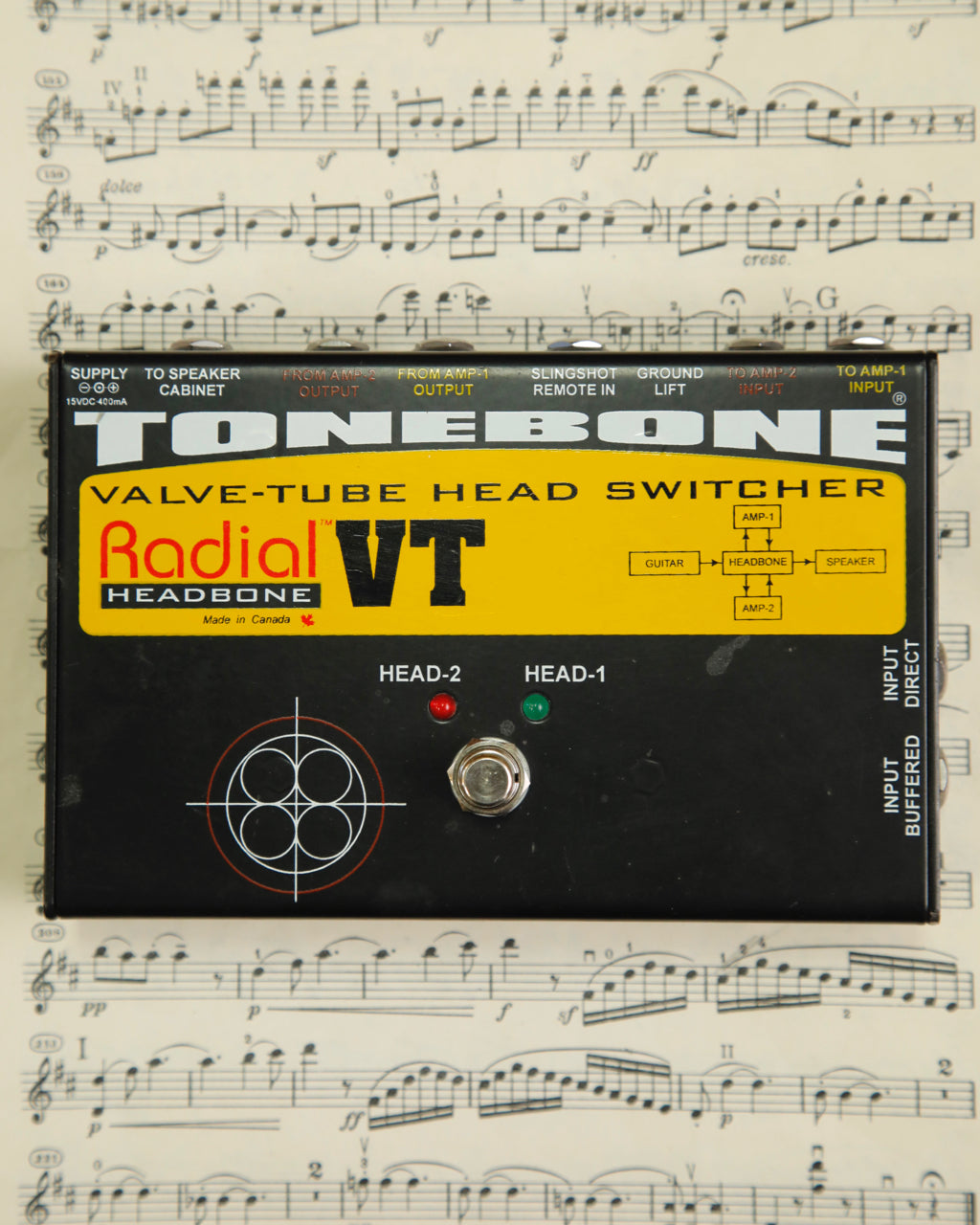• The Radial Headbone is a specially designed switching device that lets you toggle between two different guitar amplifier heads using a single speaker cabinet. With the Headbone in your rig, you can use your Marshall head for rhythm and your Mesa-Boogie head for soloing. This is of particular interest for players that demand the utmost in tonal performance when on stage or in the studio.