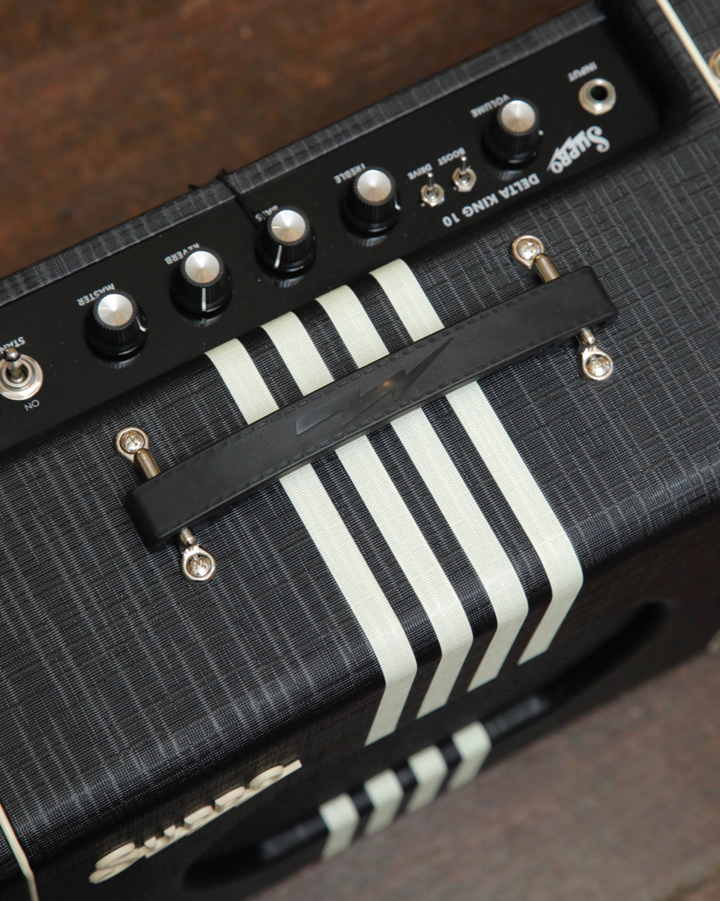 Hearkening back to the original Supro combo amplifiers, the Delta King 10 features a custom, poplar cabinet design, and two unforgettable colorways: custom tweed with black stripes, and black with cream stripes.
