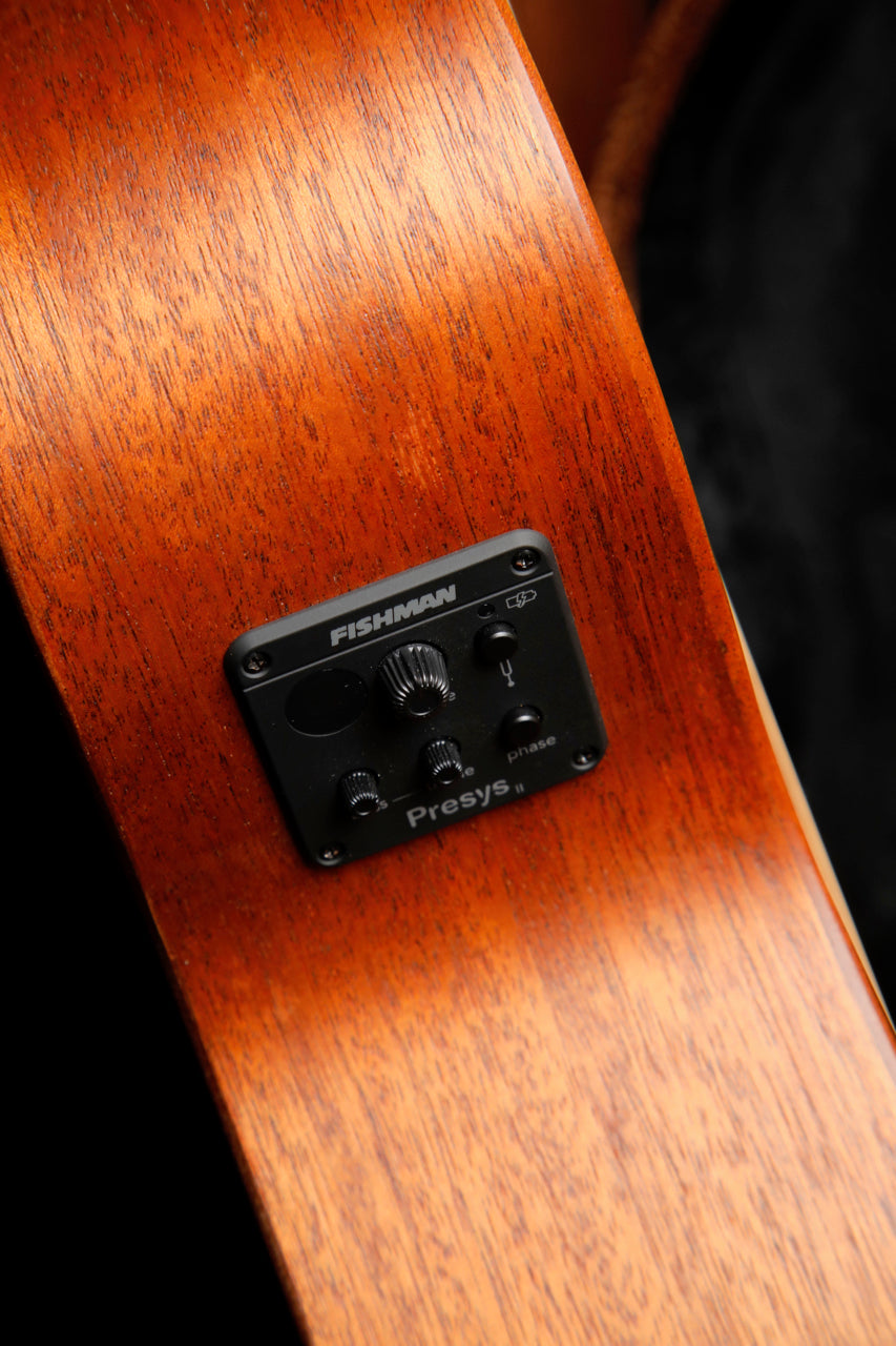 • The Fishman ISYS+ preamp system features volume, tone shaping and phase controls; a Fishman Sonicore pickup; LED tuner display and low profile control knobs. Powered by 9 volt battery (supplied).