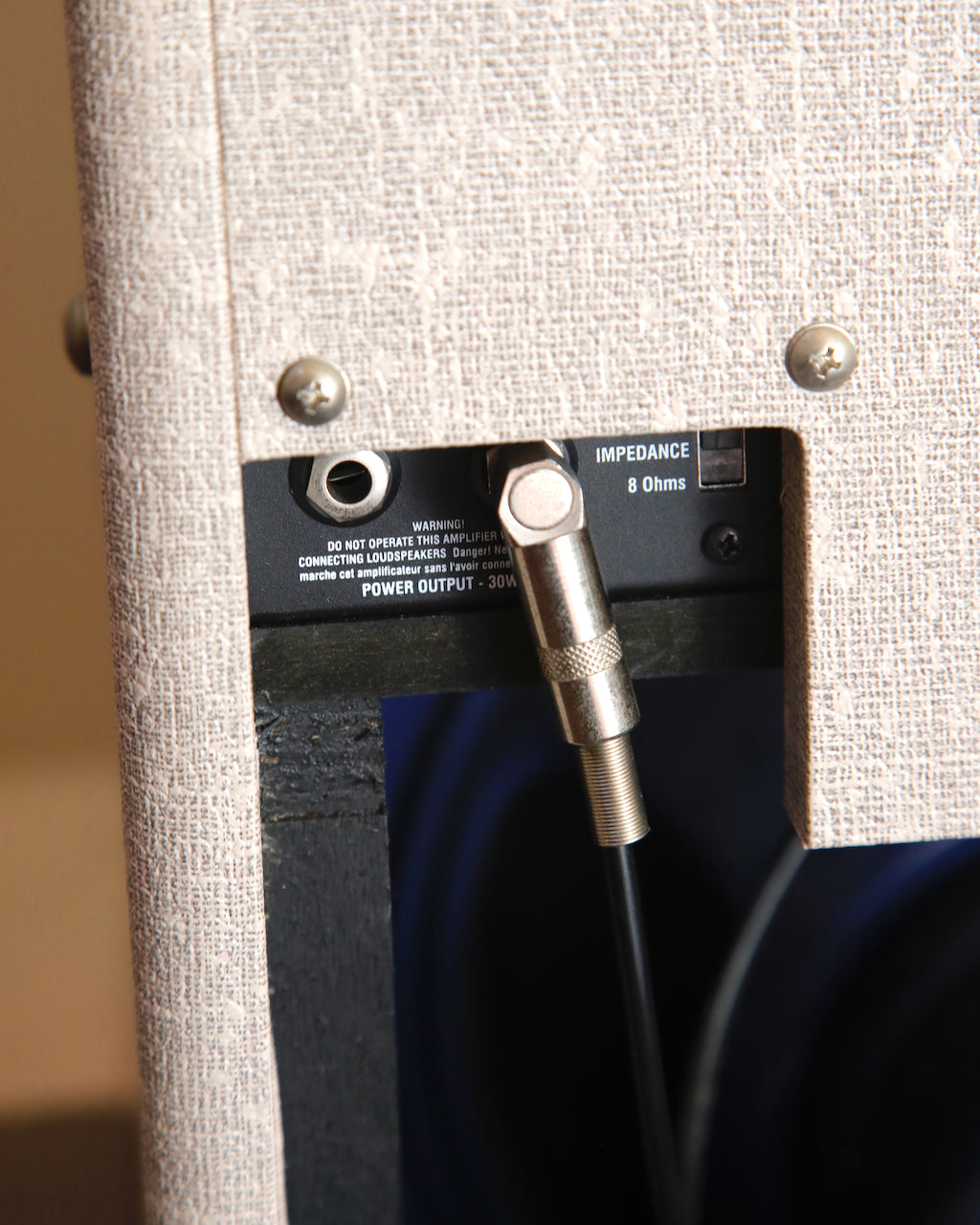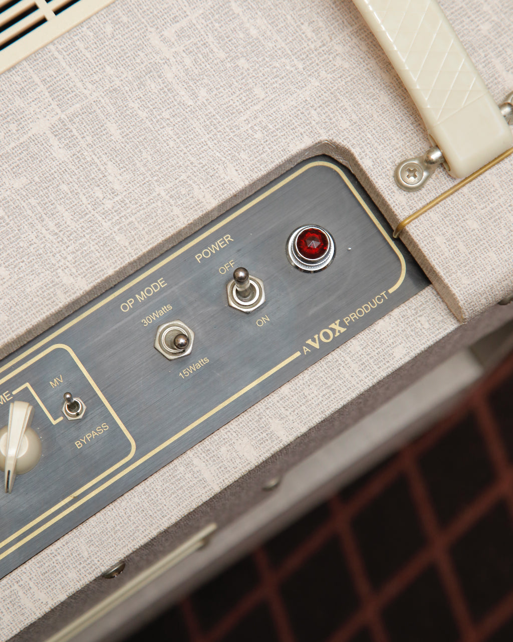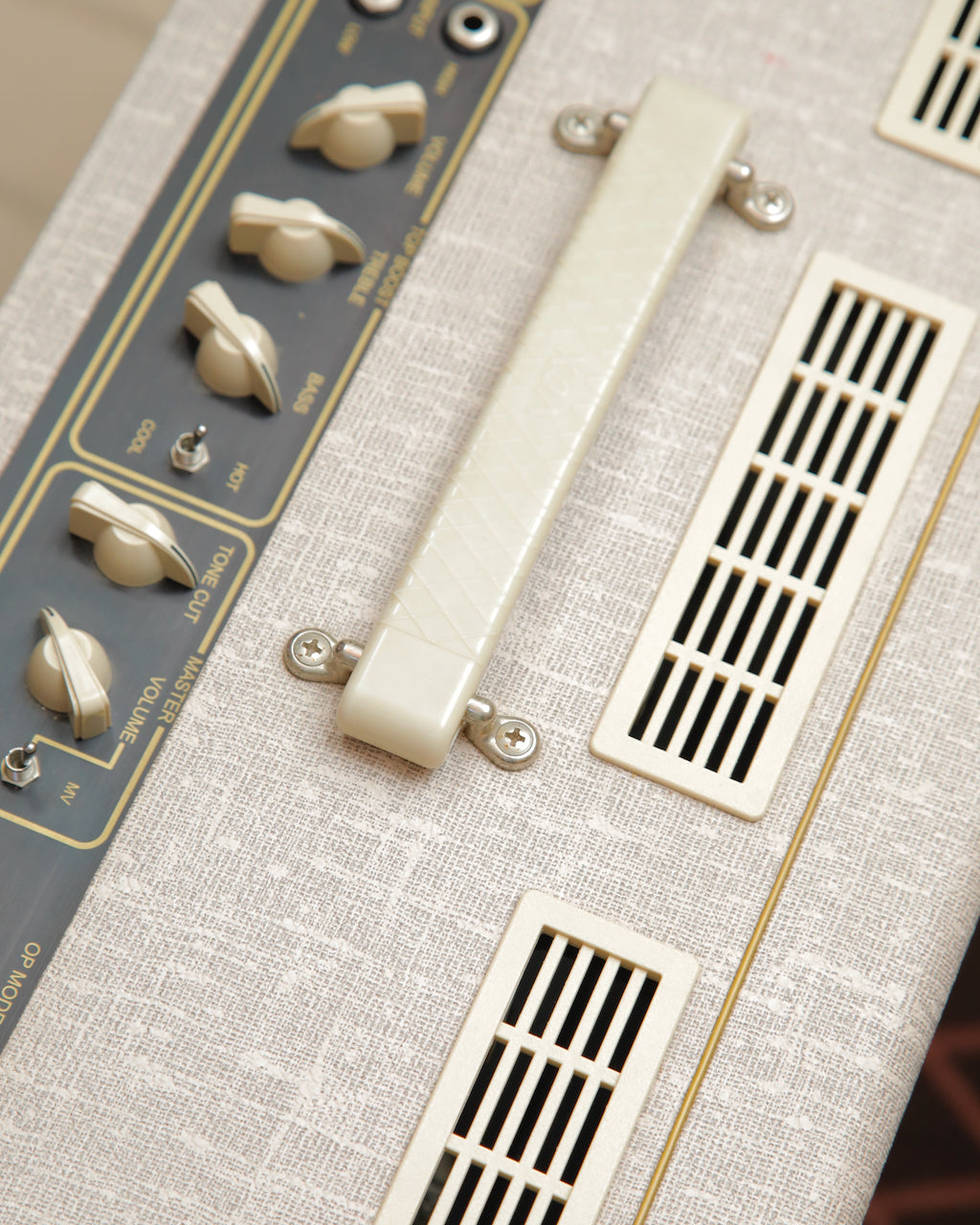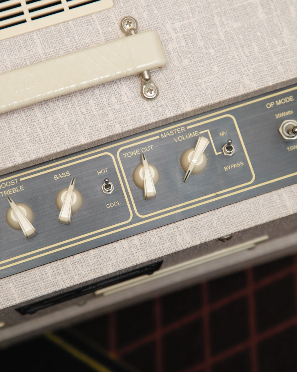 Other features include Master Volume/BYPASS switch, OP mode that can switch the amp's Output Power level, and a Birch-ply cabinet covered in vintage fawn-coloured vinyl.