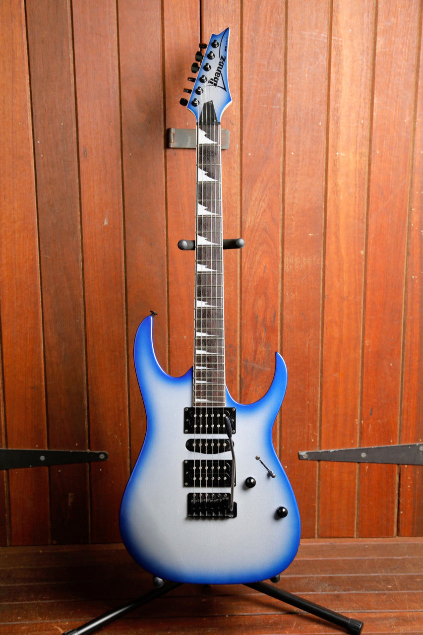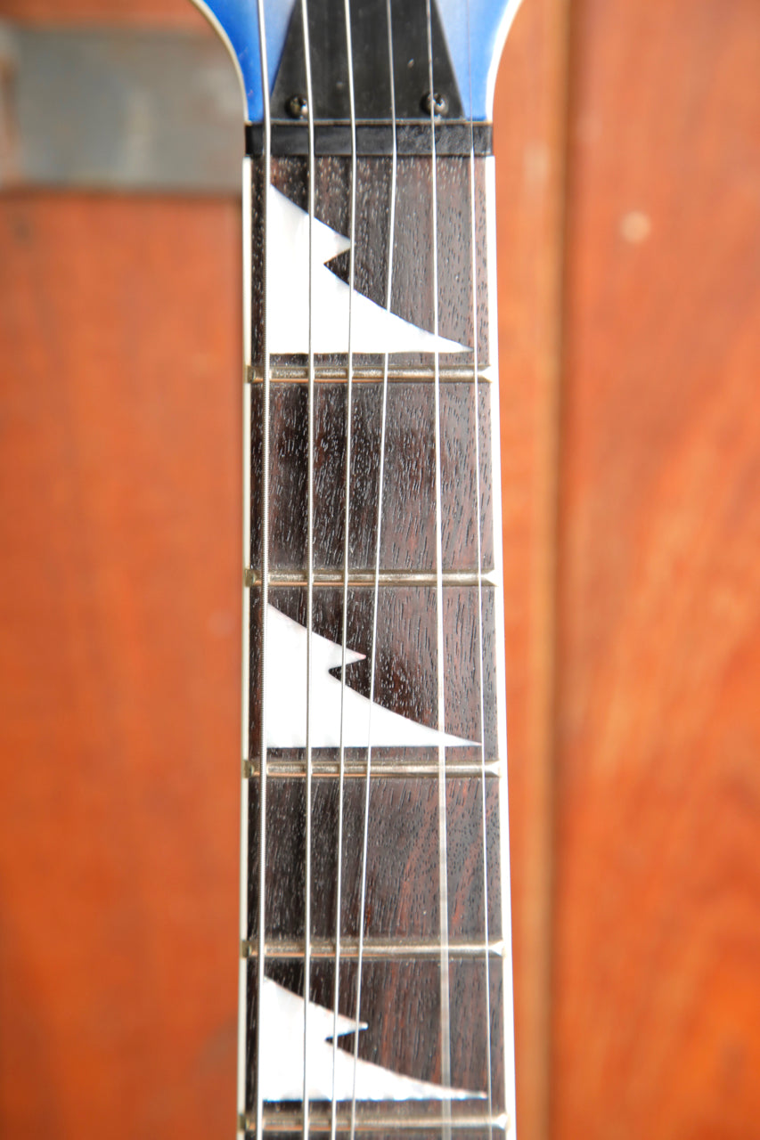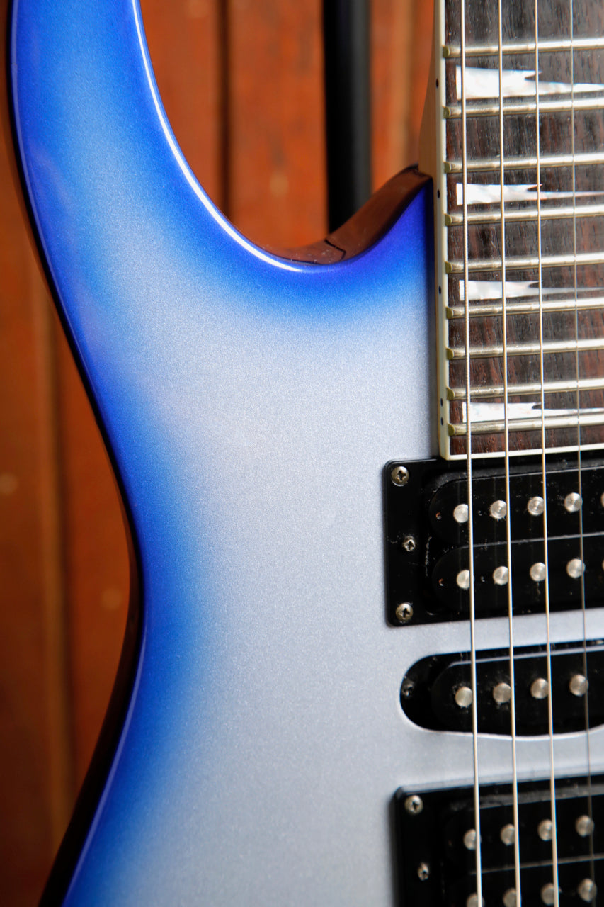 Here's a cool looking Ibanez RG180DX finished in a Blue Shadow and made in Korea. This 2002 model features a 24-fret bound rosewood fretboard with sharktooth inlays and a HSH pickup configuration.