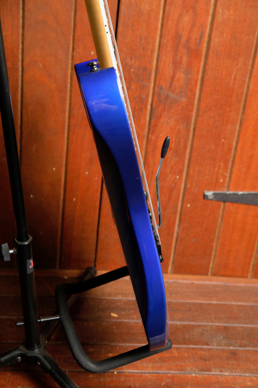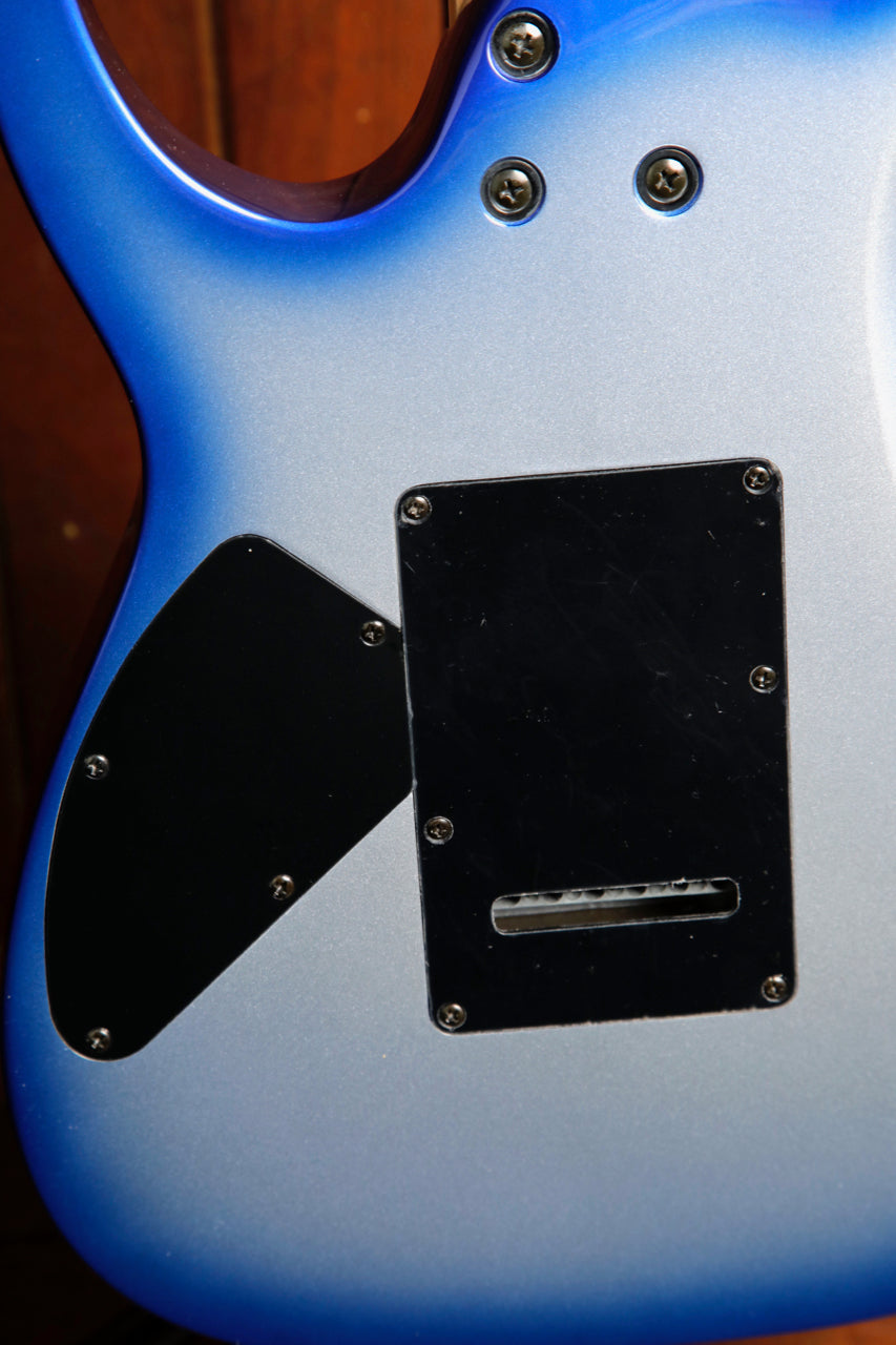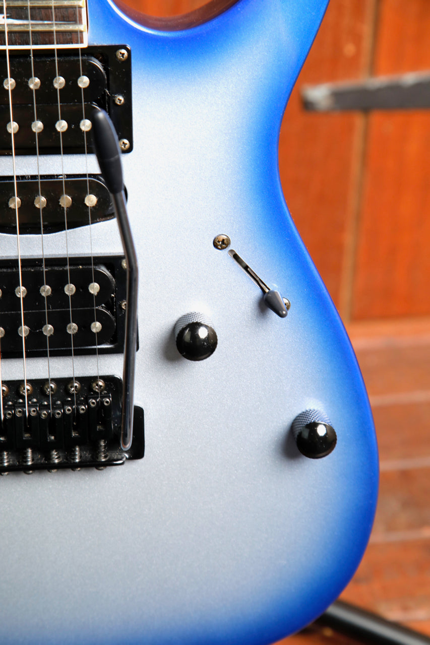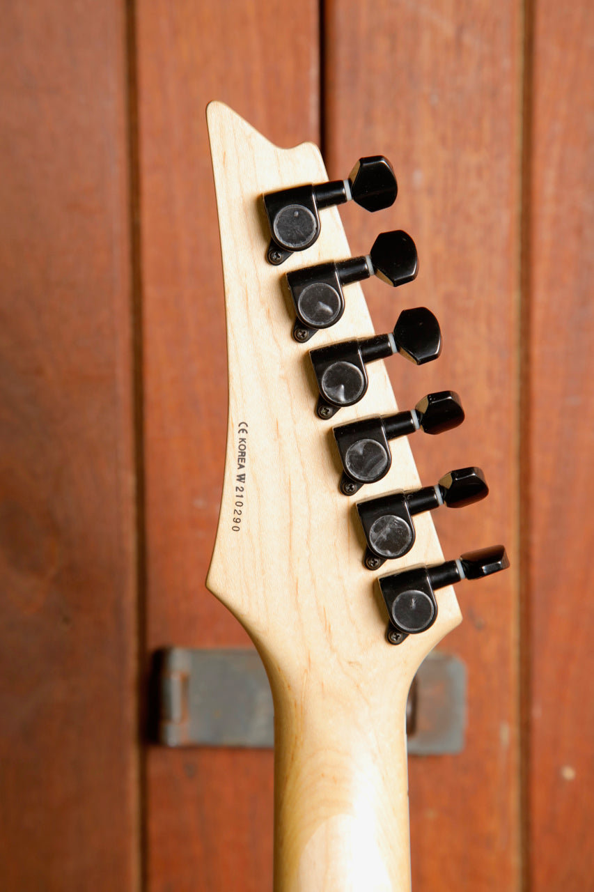 Here's a cool looking Ibanez RG180DX finished in a Blue Shadow and made in Korea. This 2002 model features a 24-fret bound rosewood fretboard with sharktooth inlays and a HSH pickup configuration.