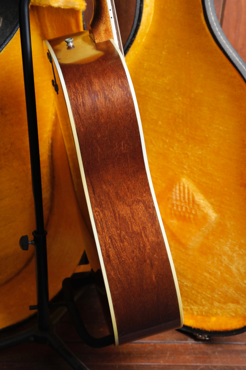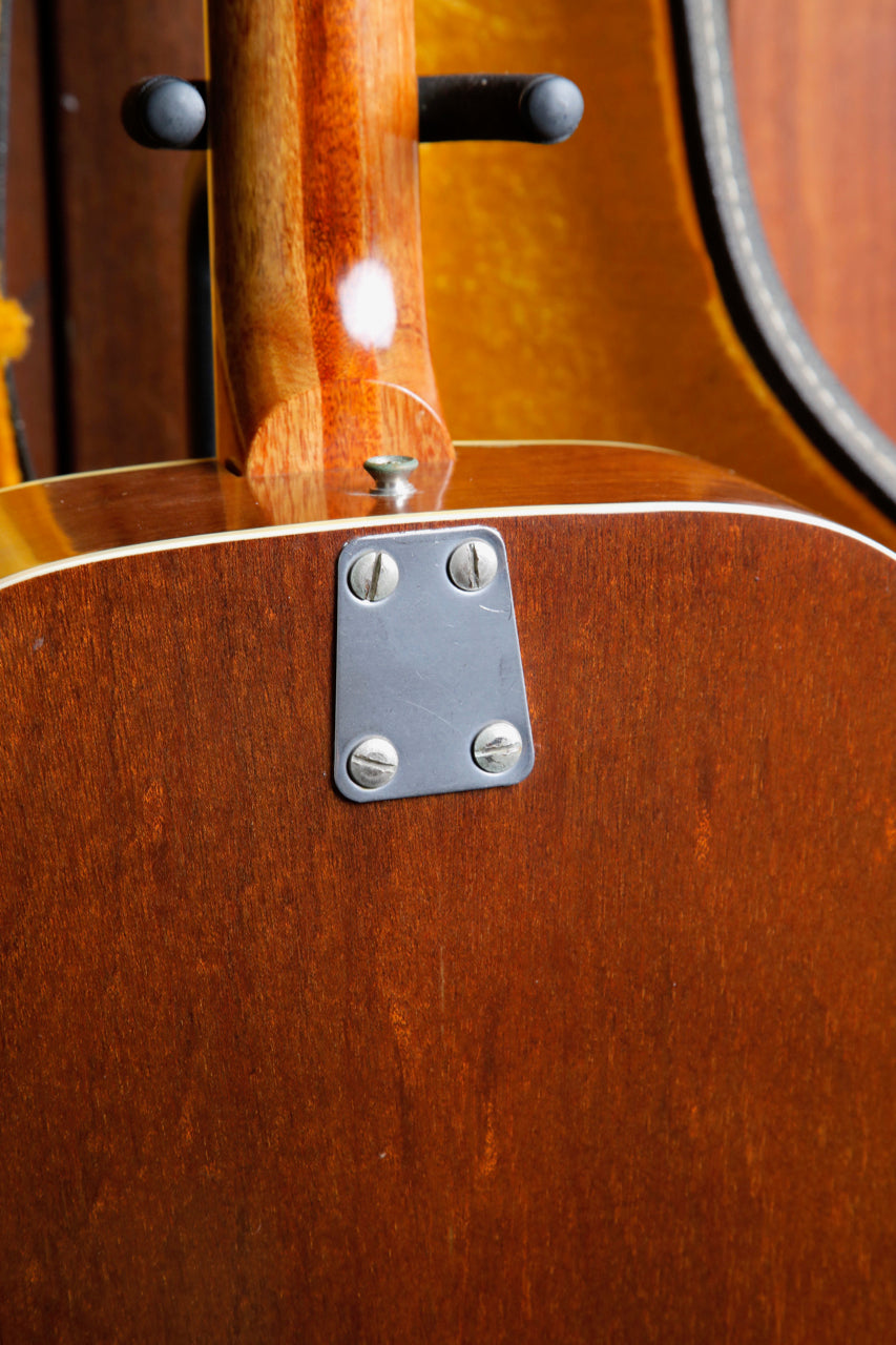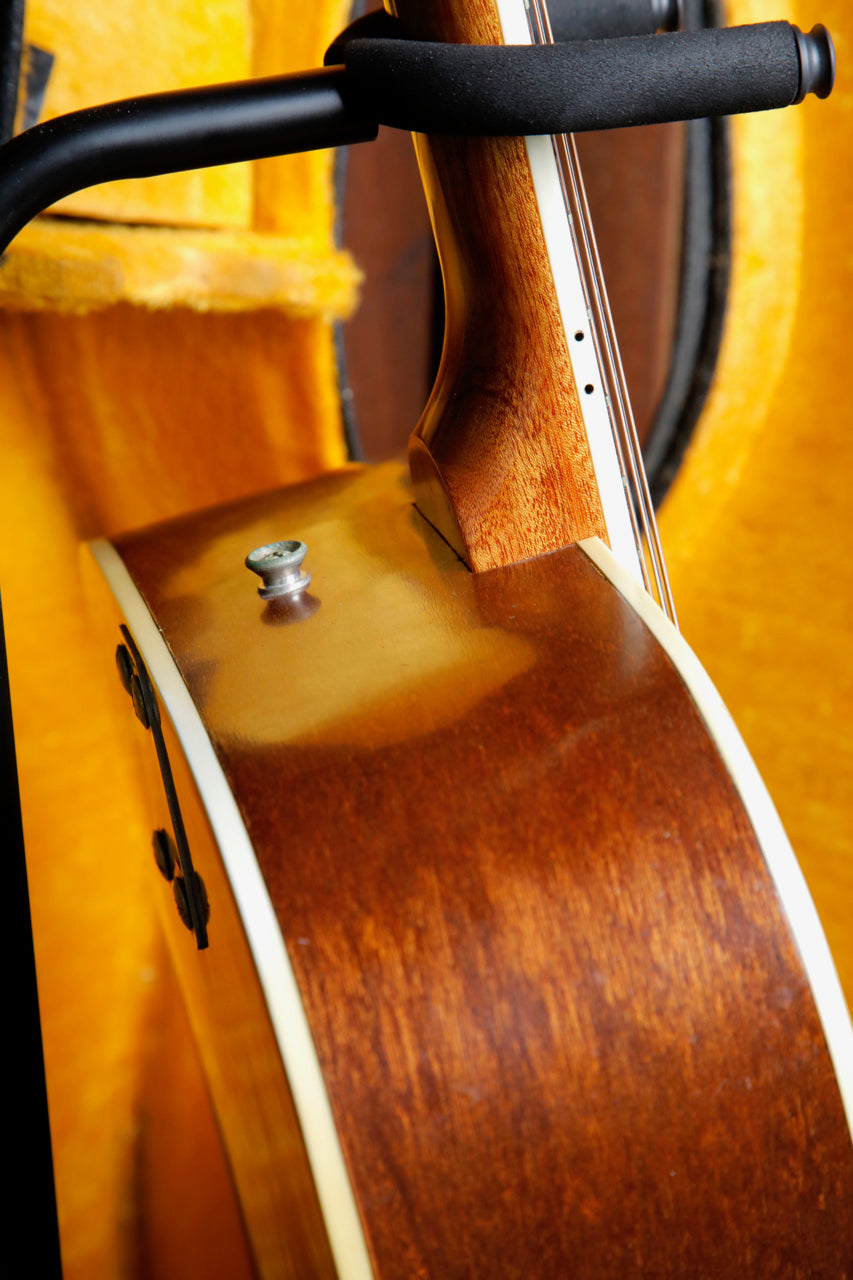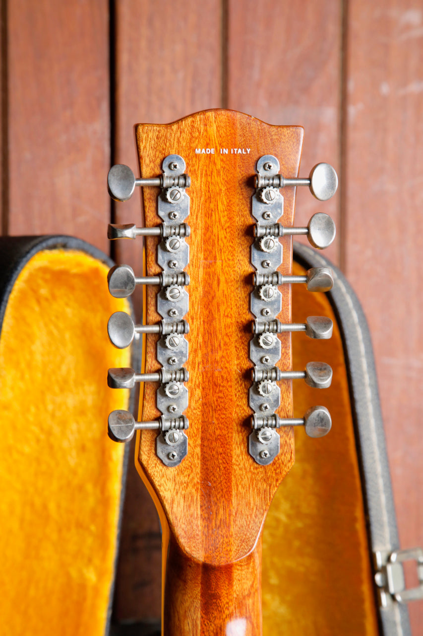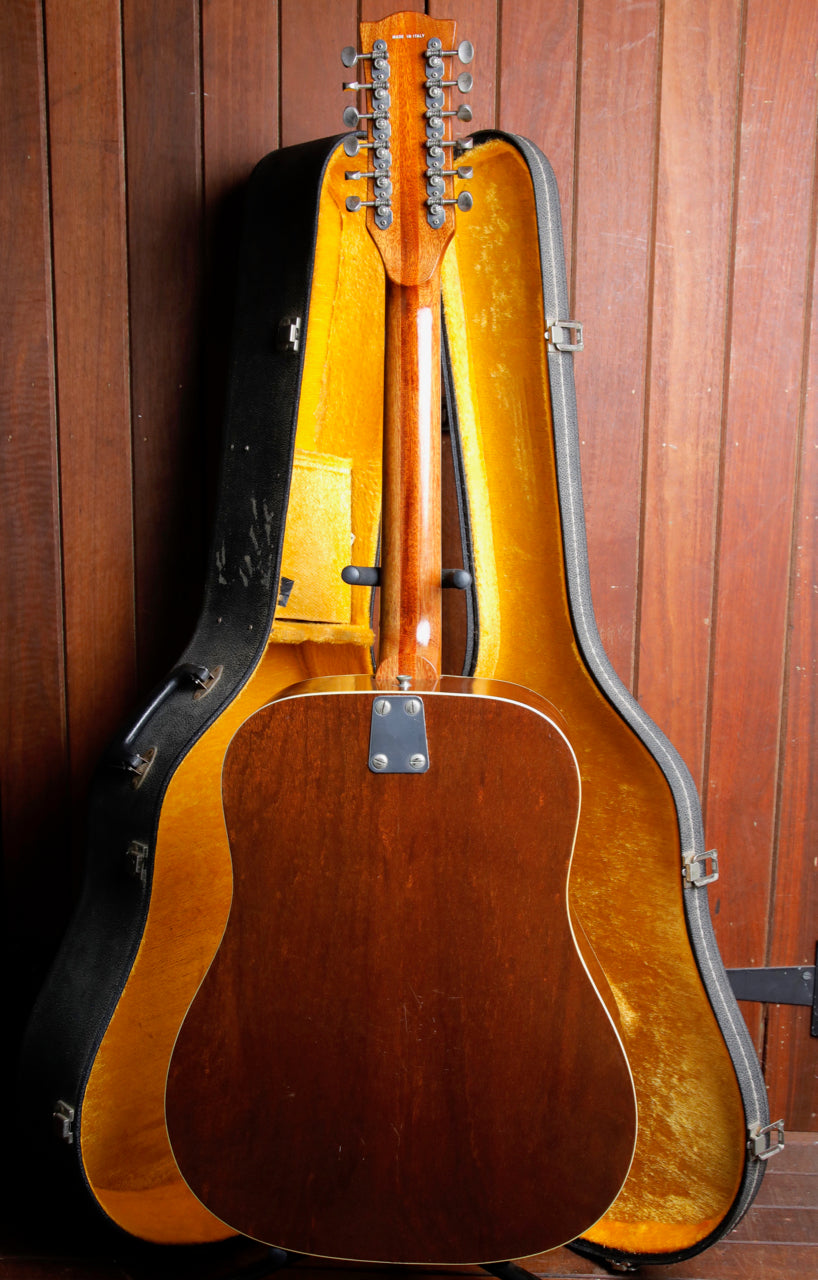 Due to the high stresses of the 12 strings on the guitar, it's very common to see the bridge 'lifting' (separating from the body), or a re-glued bridge (which is preferable, as it 'future proofs' the guitar from damage later on). This guitar looks to have had the bridge professionally re-glued at some point, which on a vintage 12-string guitar, is great news for the next owner.