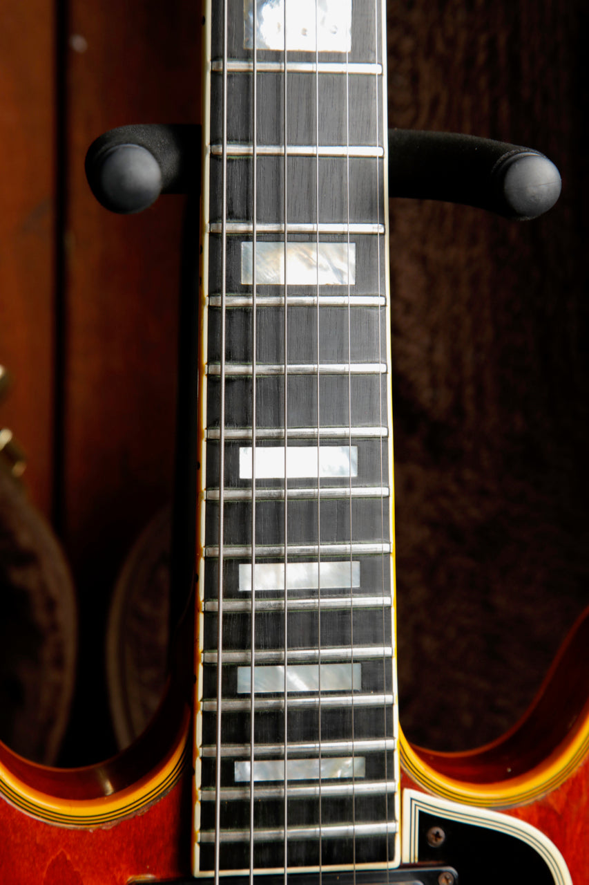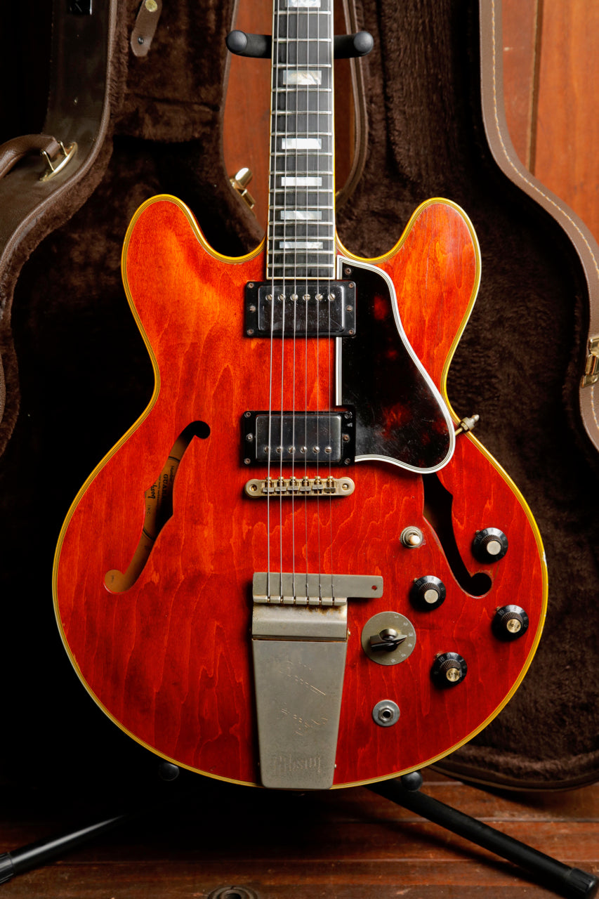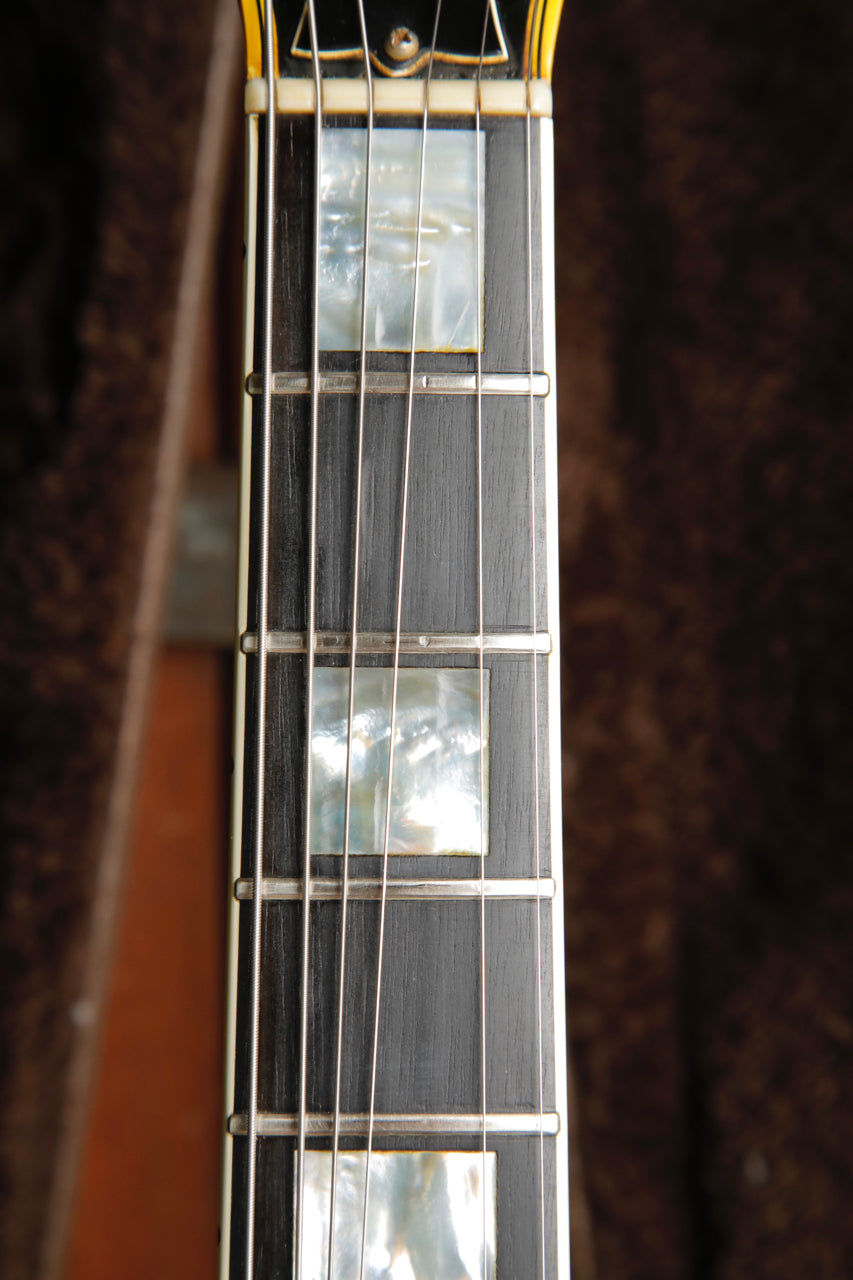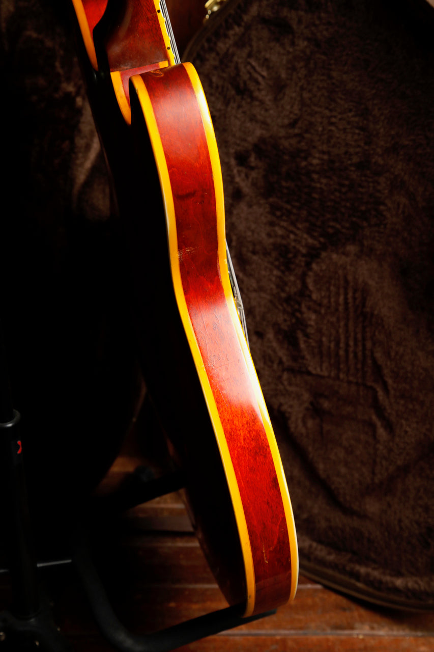 This guitar is in good player-grade condition with some obvious dings and scratches as pictured. The Maestro tailpiece is also missing its tremolo arm and the frets show significant wear as pictured.