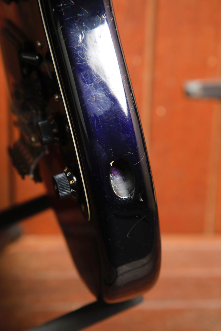 This guitar does show some sings of age and use with stickers on the back and a lacquer chip from previous sticker removal. There is also patina to the hardware and some fret wear as pictured.