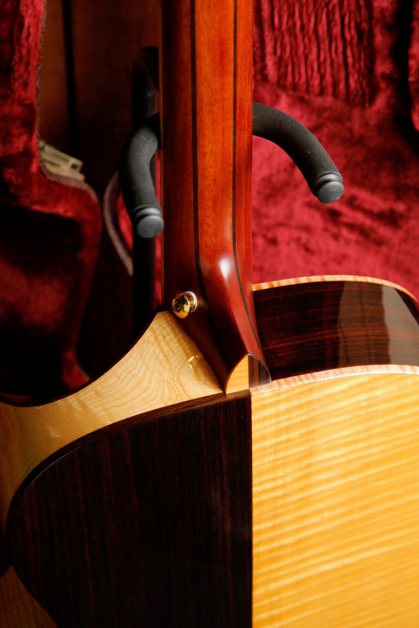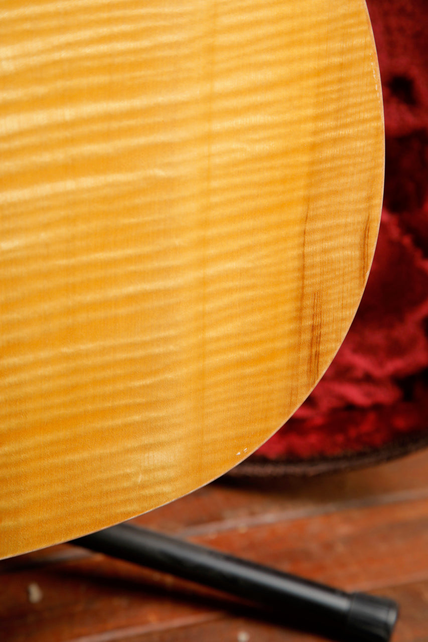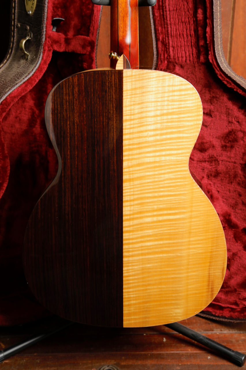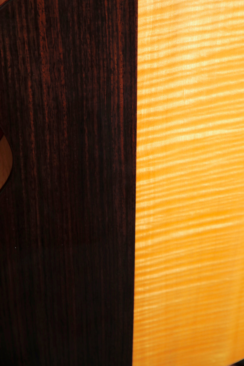 This guitar has a lovely spruce top which offers a lot of projection. It also features a comfortable maple arm bevel and rosewood bevelled cutaway. The back and sides are mirrored in wood selection with quality Flamed Maple & Indian Rosewood.