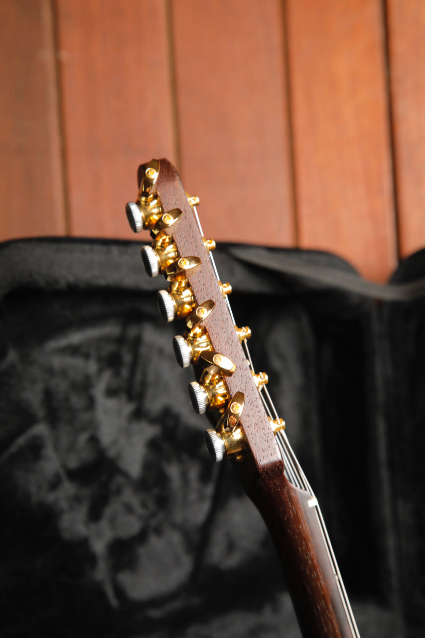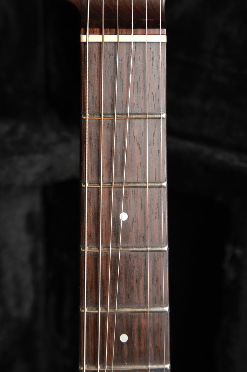 This guitar has only seen light use and shows minimal wear with some patina to the gold hardware and tiny marks. The frets are also in excellent condition with minimal wear as pictured.