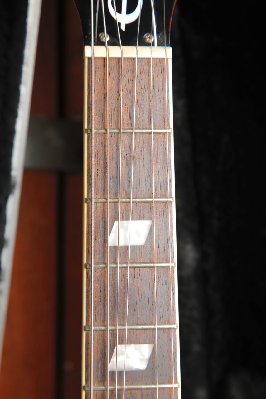 The Epiphone Riviera, one of Epiphone’s original, most enduring classics makes a comeback! First introduced in the early ‘60s, the Epiphone Riviera’s semi-hollow design has been a favorite of players from all genres and generations including blues greats Robben Ford and Otis Rush, Lou Reed of the Velvet Underground, and The Strokes’ Nick Valensi, who have all found that the Riviera’s legendary ES™ body shape can produce great tones with any pickup variation. This Riviera features a layered maple top back and sides, a 3-layer pickguard with the classic metal Epiphone “E”, and comes equipped with Epiphone's LockTone™ Tune-O-Matic™ adjustable bridge and Frequensator tailpiece.