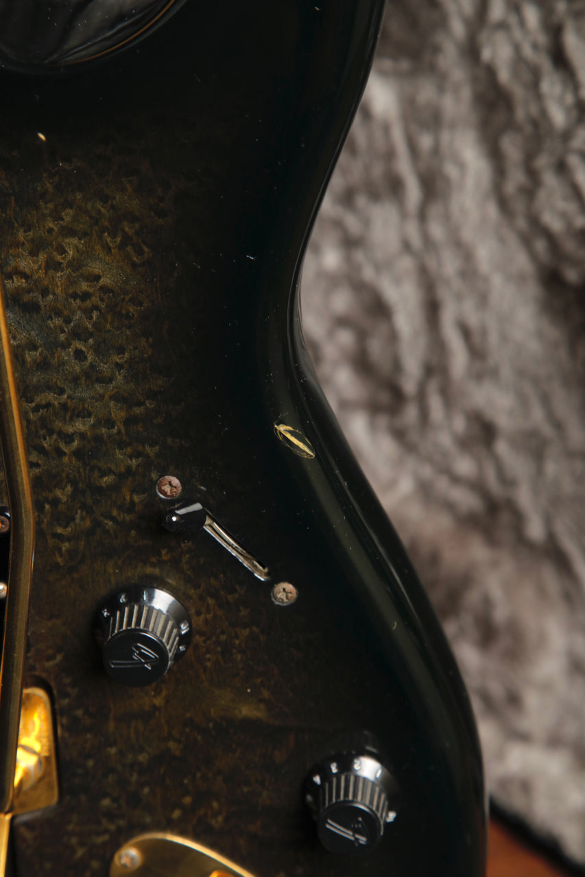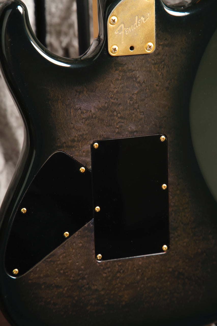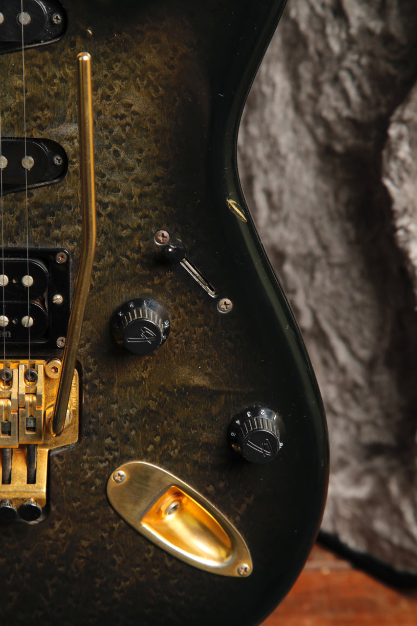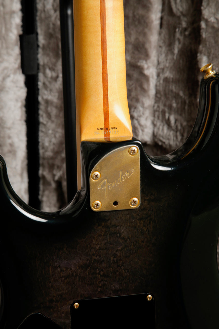 Here's quite an interesting Strat! This Fender Contemporary Series Stratocaster Deluxe was made in Japan between 1985 and 1987. This Stratocaster features a Transparent Black Burst finish over a figured body and a Fender Ex-Trem Folyd Rose Tremolo System.