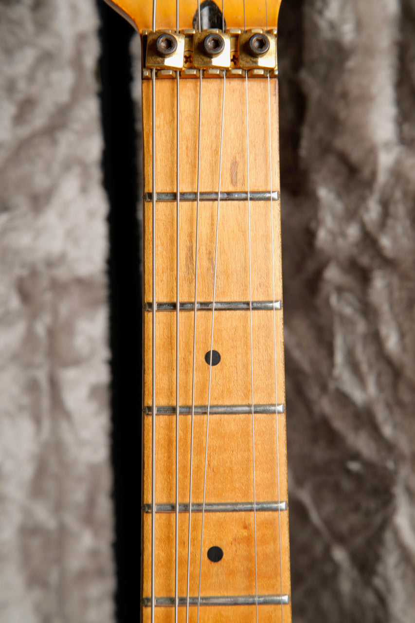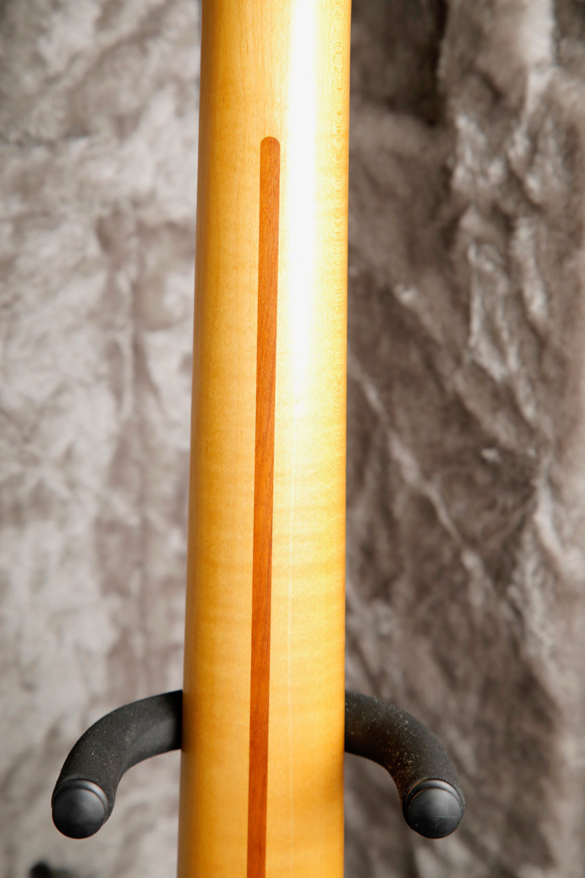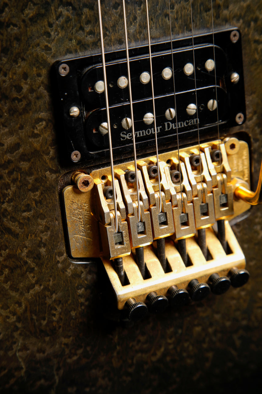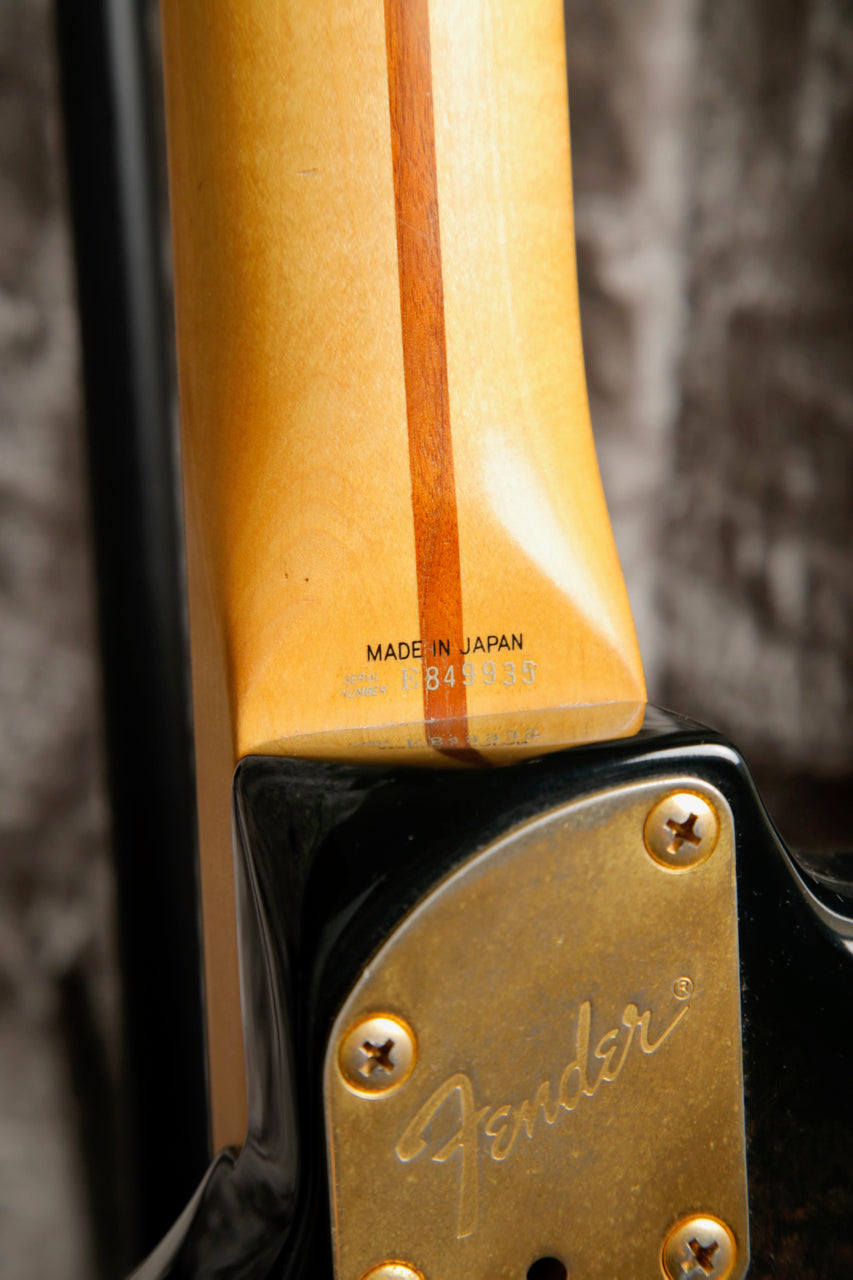 Here's quite an interesting Strat! This Fender Contemporary Series Stratocaster Deluxe was made in Japan between 1985 and 1987. This Stratocaster features a Transparent Black Burst finish over a figured body and a Fender Ex-Trem Folyd Rose Tremolo System.