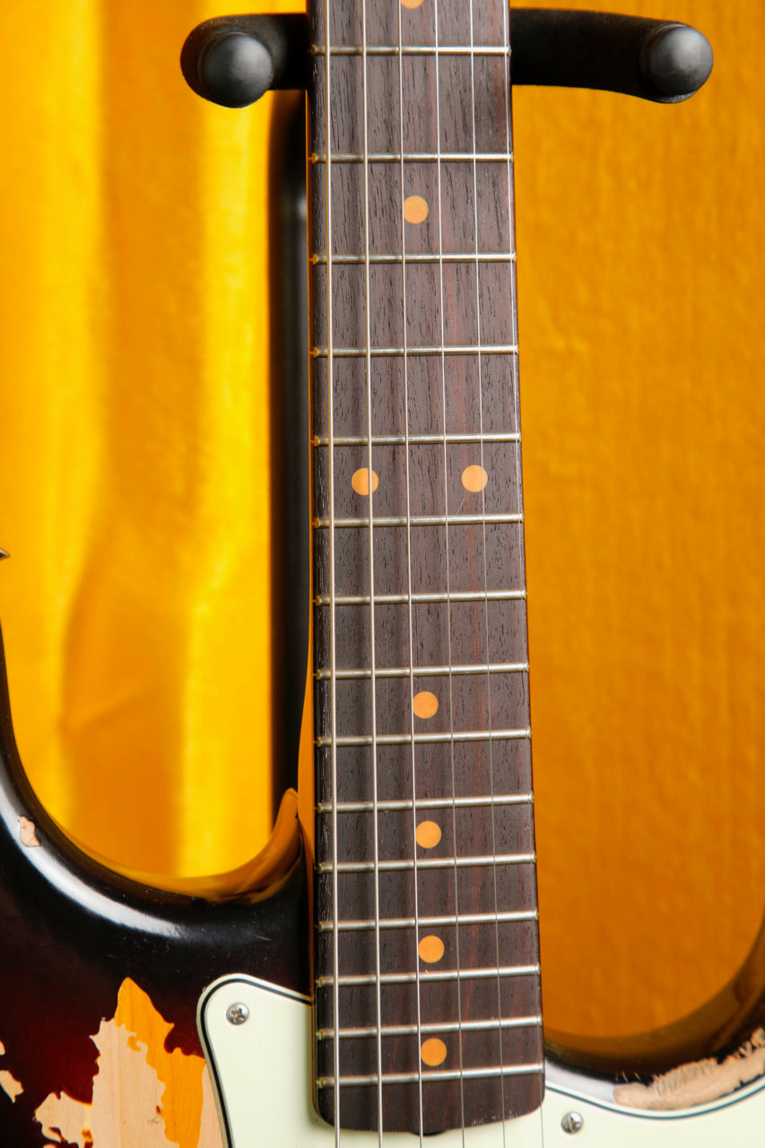 The Mike McCready Stratocaster® features a hand-crafted, heavily Road Worn® lacquer finish over an alder body, recreating the battle scars Mike's own Strat has earned over three decades of grueling, sold-out tours and legendary performances. The comfy 9.5" radius slab rosewood fingerboard on a slim "C" maple neck are shaped to match McCready's treasured 1960 Strat, while the custom Mike McCready Stratocaster pickups are voiced to replicate Mike's vintage single-coils for the same timeless tone, passion and energy that define his signature sound. The vintage-style synchronized tremolo, bent-steel saddles and cold-rolled steel block ensure the purest Fender tone and performance.