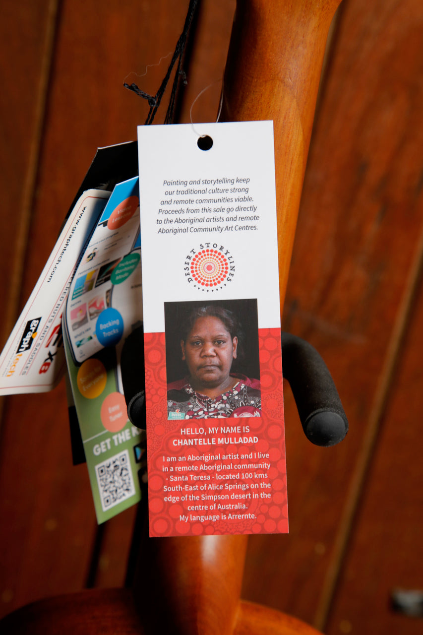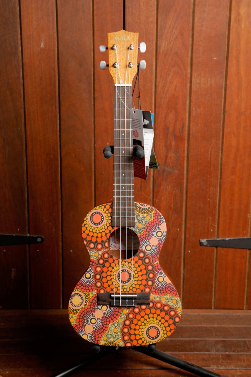 This brand new Desert Storylines range from Kala features genuine artwork by three Australian Aboriginal Artists. Margaret Bloomfield, Evelyn Young and Chantelle Mulladad live and work in Santa Teresa, a remote Aboriginal community 100 kilometres South-East of Alice Springs. A royalty on the sale of each ukulele is directed to these three artists.