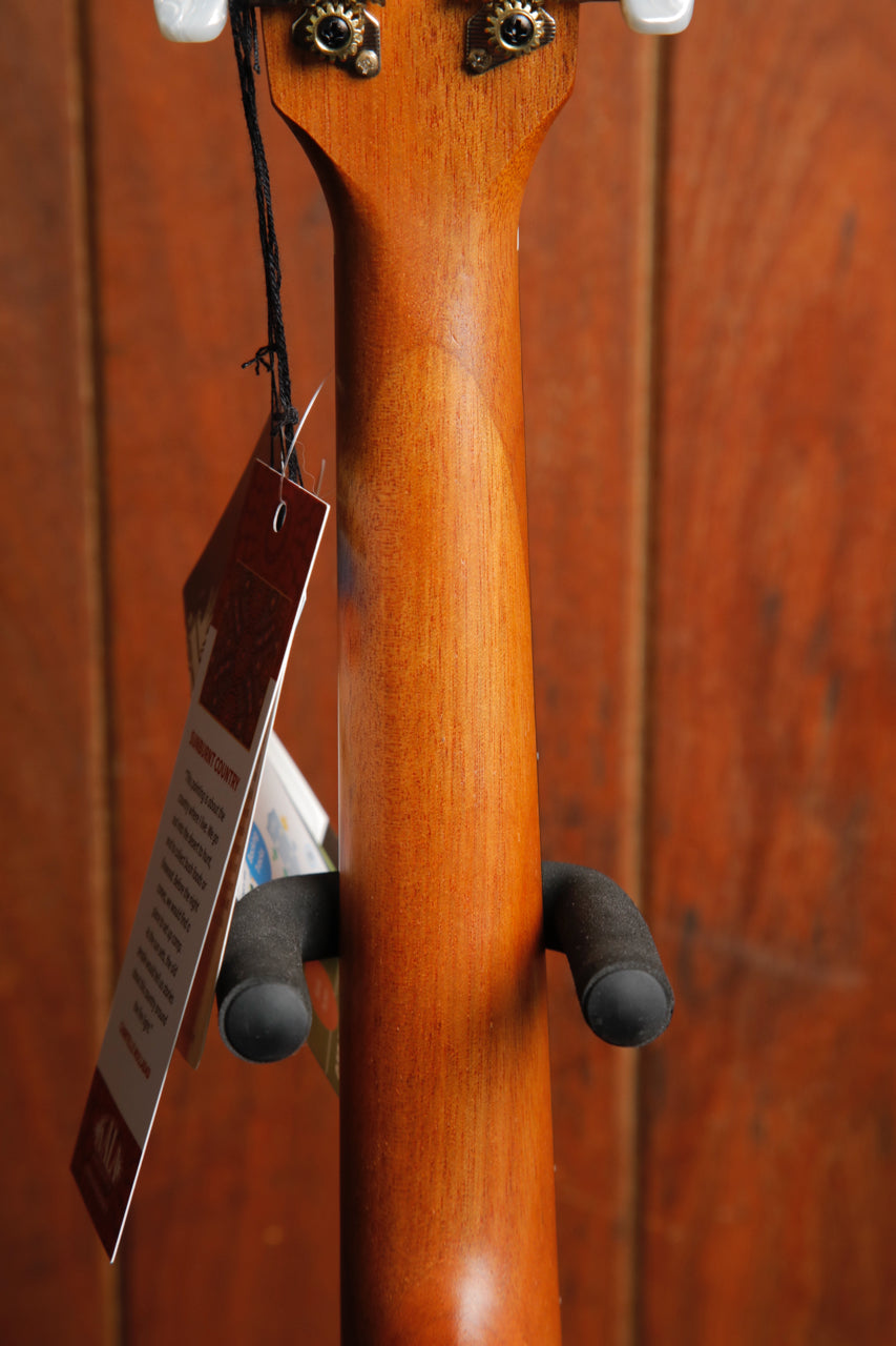 This Tenor size ukulele features mahogany top, back & sides and is finished in a piece titled 'Sunburnt County' by Chantelle Mulladad.