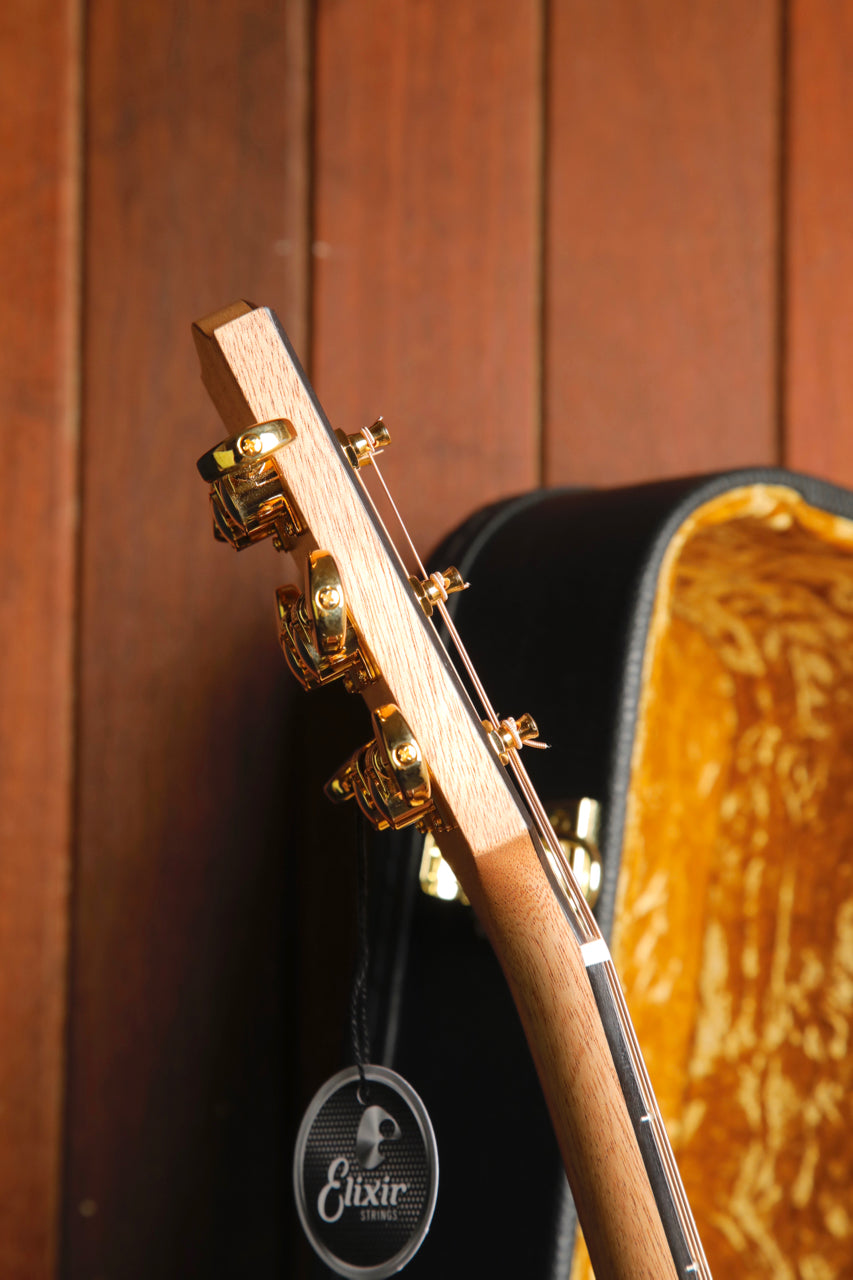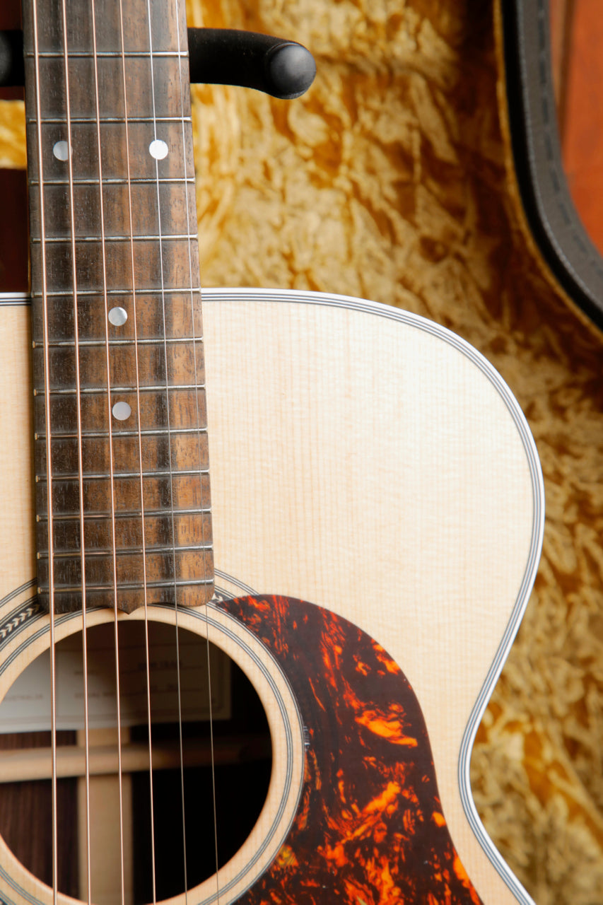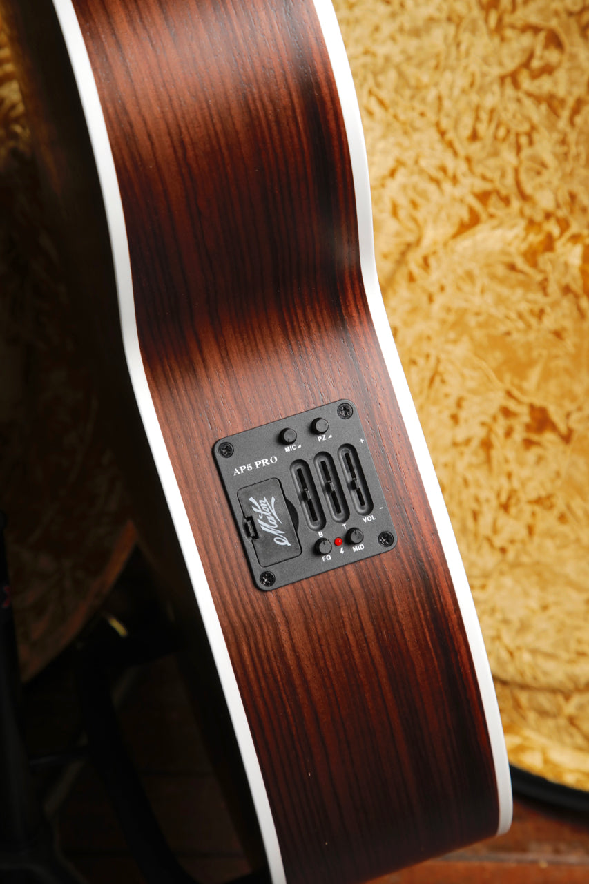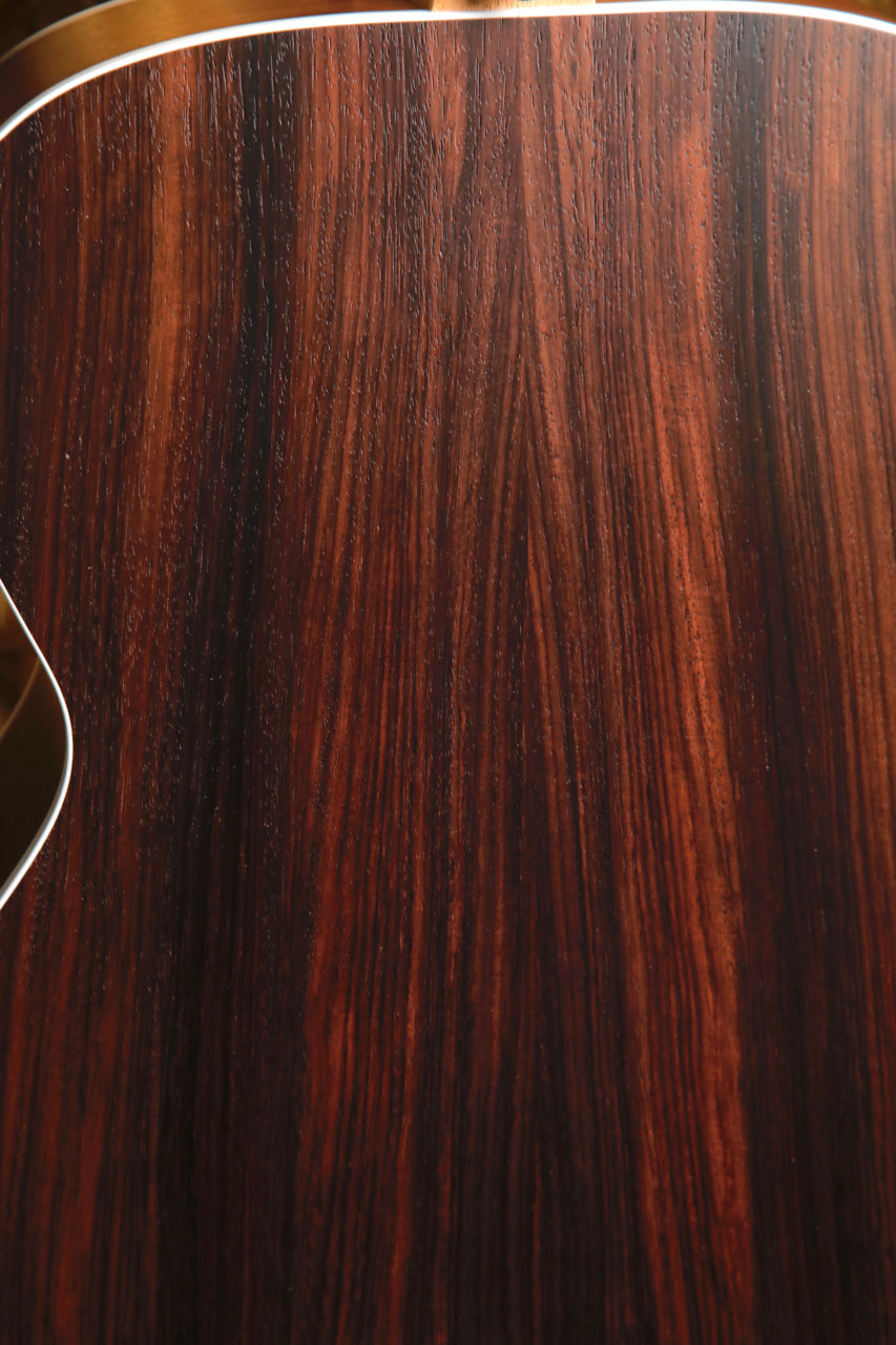 The result is a small-bodied guitar with a full tonal response that rings like a bell. There is no lack of bass due to the thinner body depth (the body is 10mm thinner than the 75th Anniversary body) as the depth is offset by the incredible rich bass produced by the rosewood back and sides. The reduced body depth also provides a little more focus in front of the guitar which will make it a brilliant recording instrument.