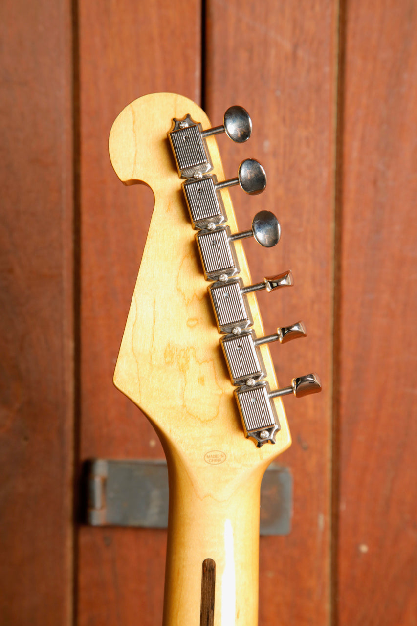Vintage style electric guitar. Traditional 60's style solid basswood body. Maple neck with maple fingerboard. 21 frets. 3 single coil pickups. 1 volume and 2 tone controls. 5 way switch. Ivory pickup covers and knobs. Vintage mint green 3 ply scratchplate. Chrome Kluson style machine heads. Vintage tremolo. Supplied with SX heavy duty 7mm padded gig bag